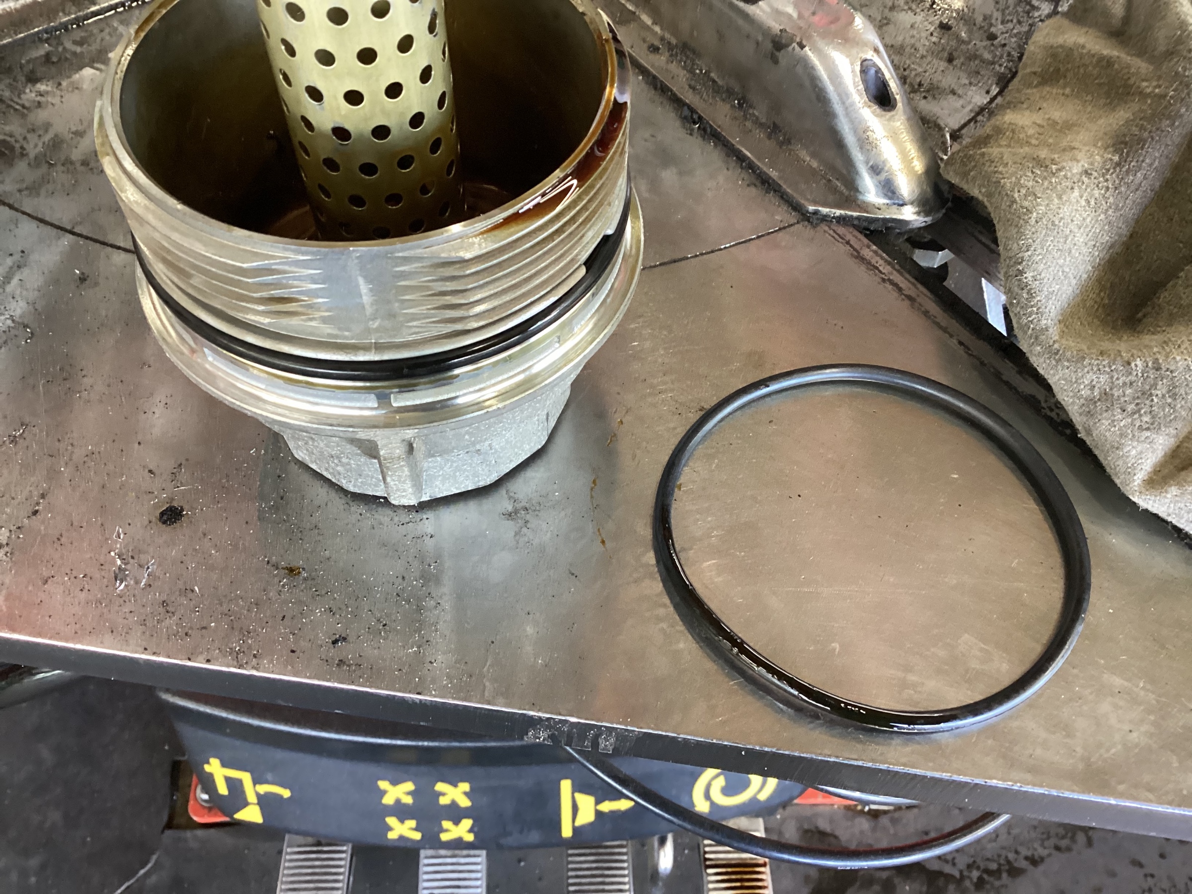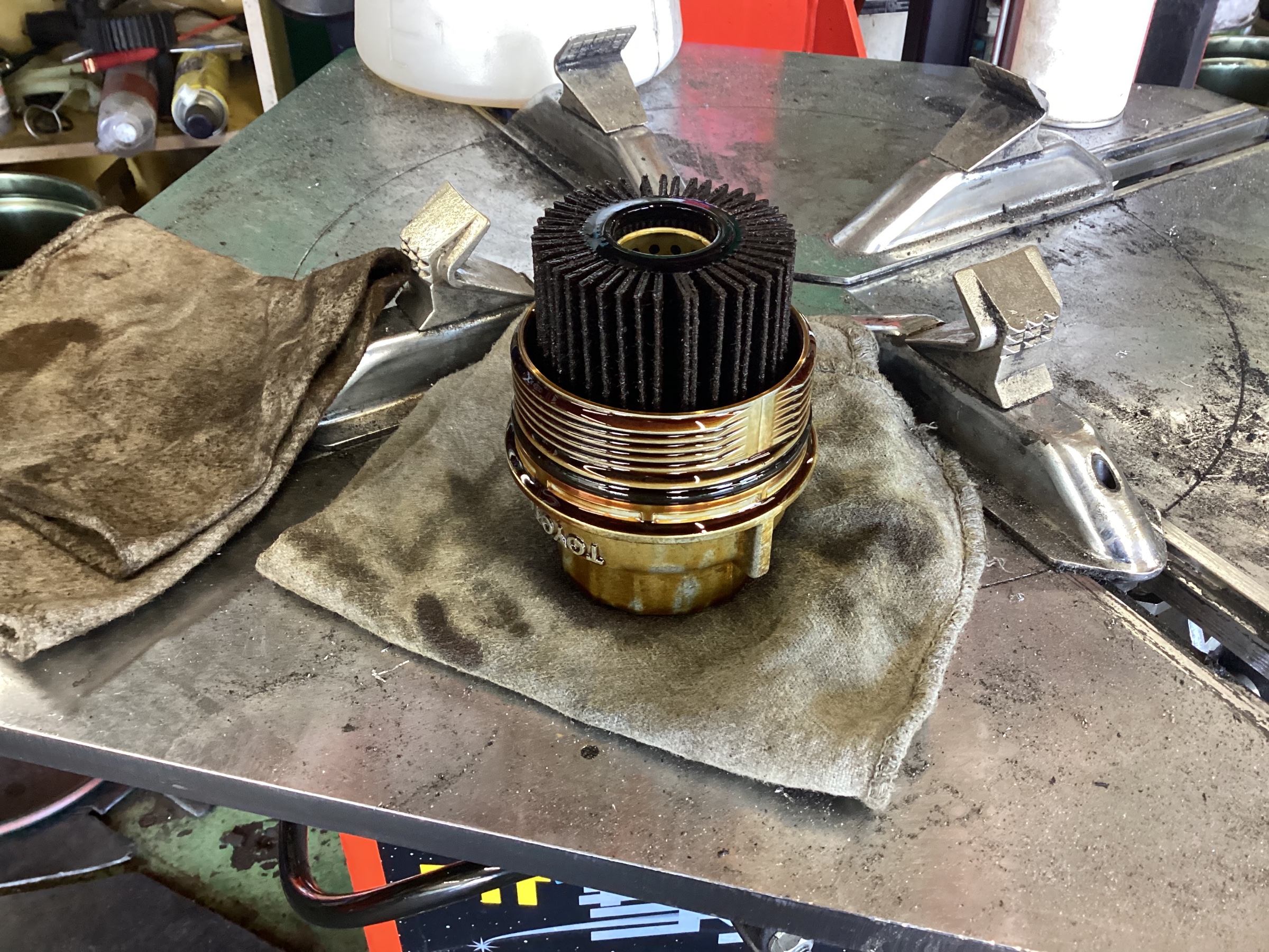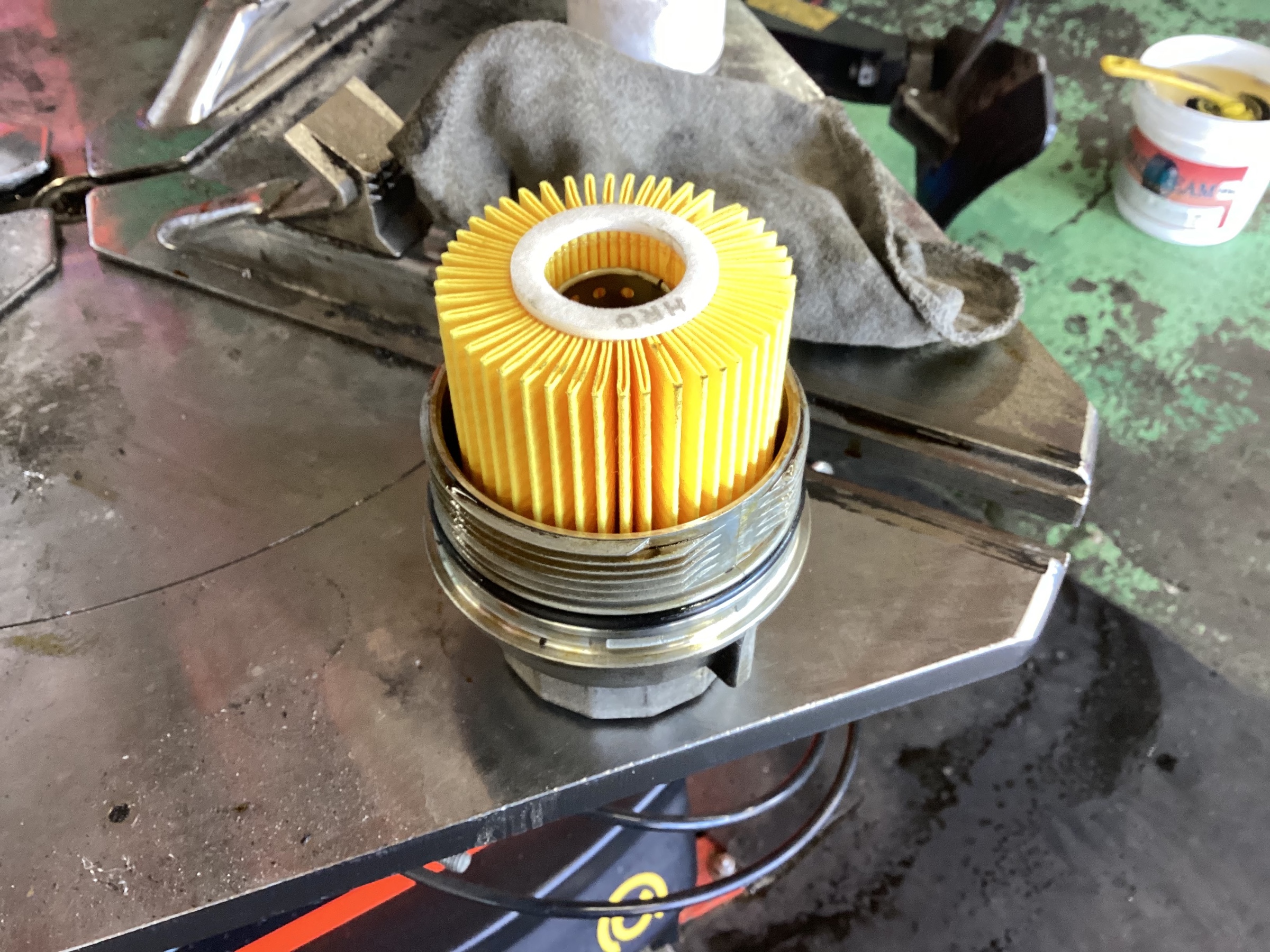 取り外したオイルフィルターのケースをキレイに清掃してから新品のパッキンに交換して、車に戻します。