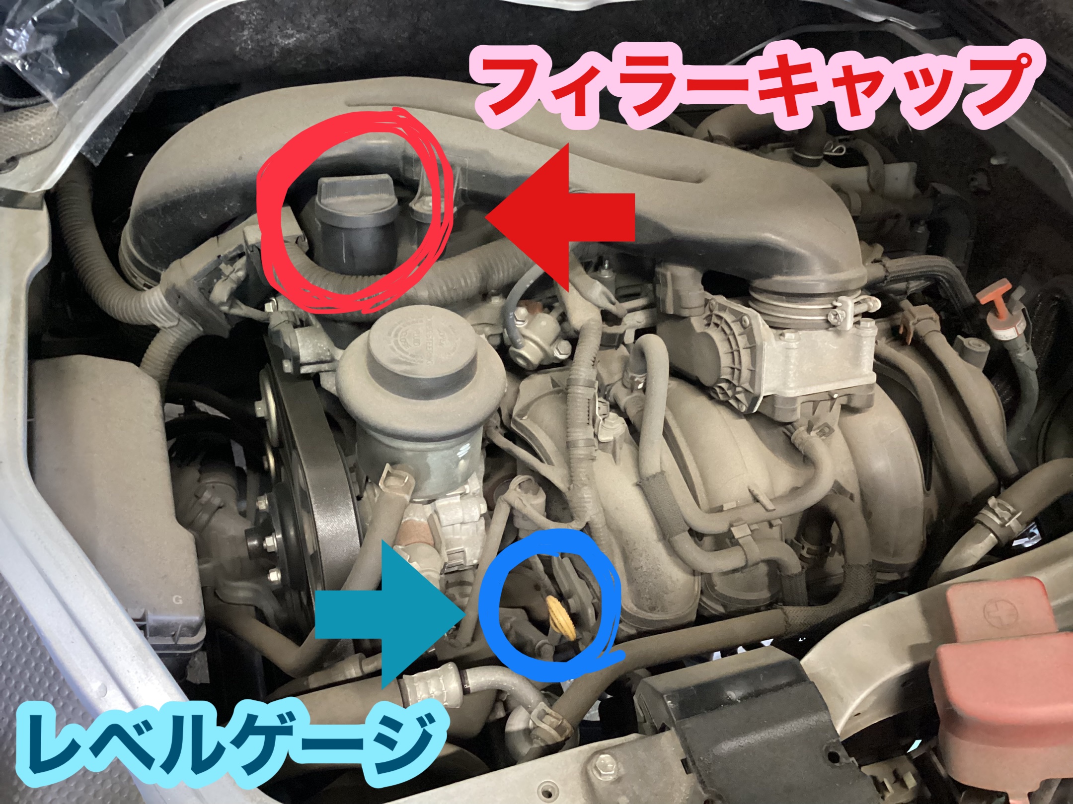 助手席を持ち上げるとオイルを注入するフィラーキャップや、レベルゲージなどがあります。