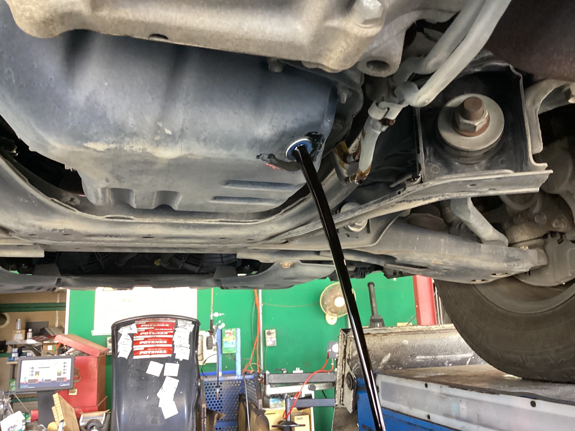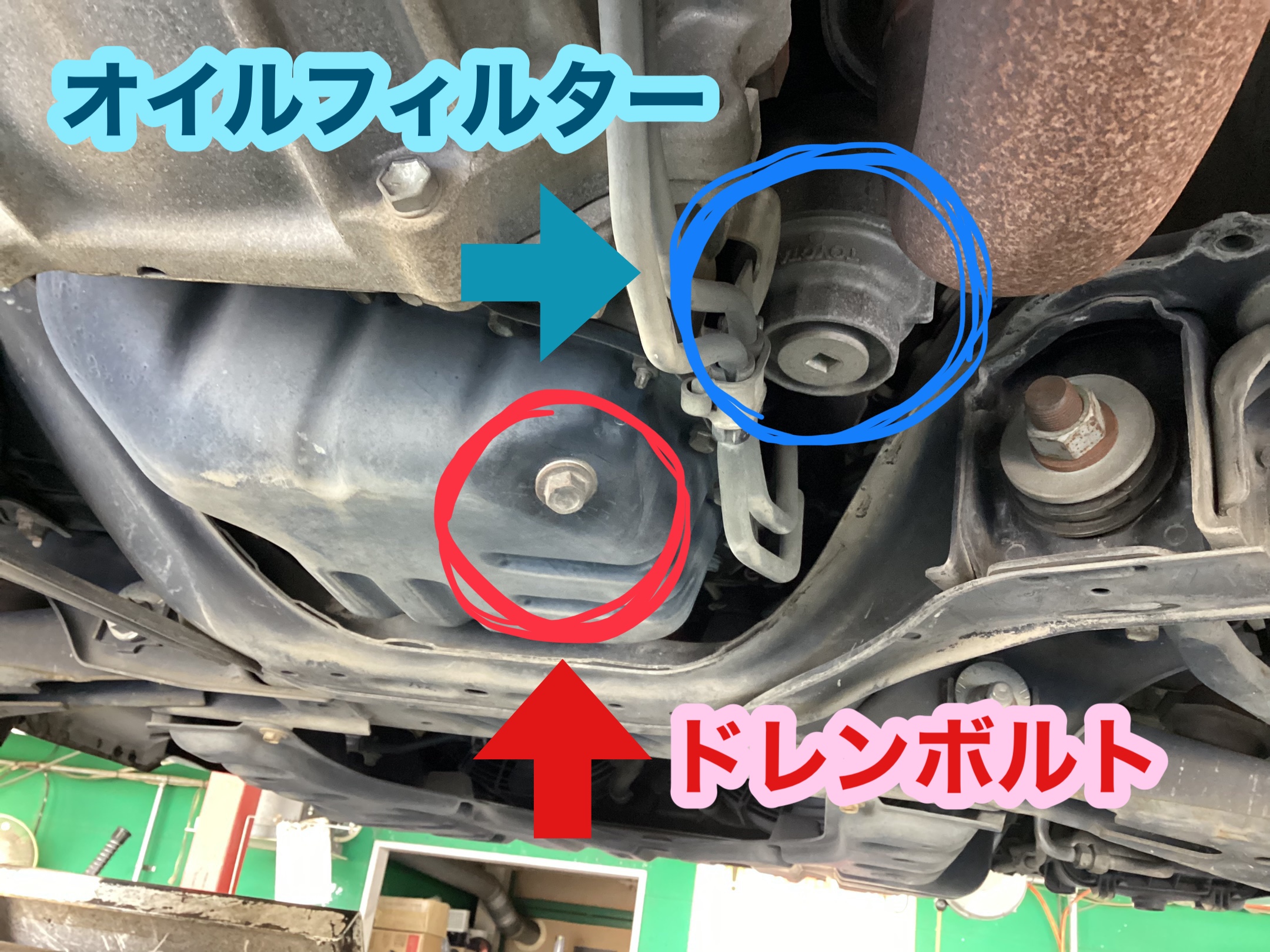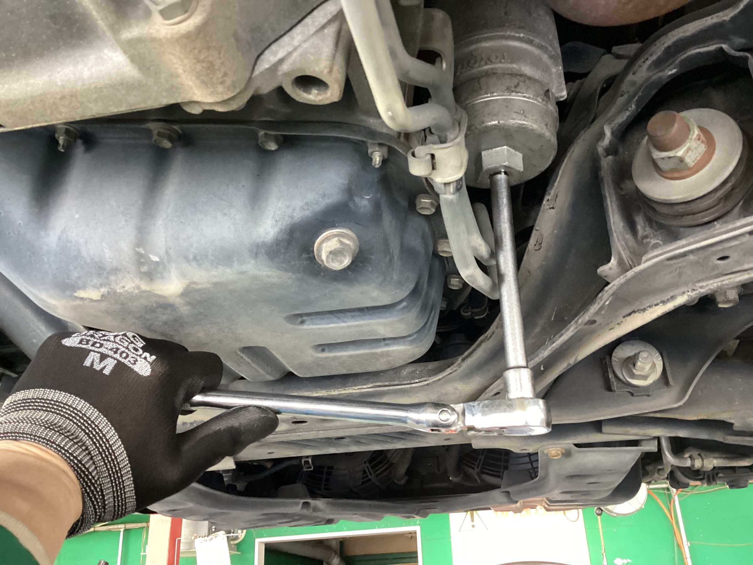 車をリフトアップし、ドレンボルトとオイルフィルターを取り外し、エンジンオイルを排出していきます。