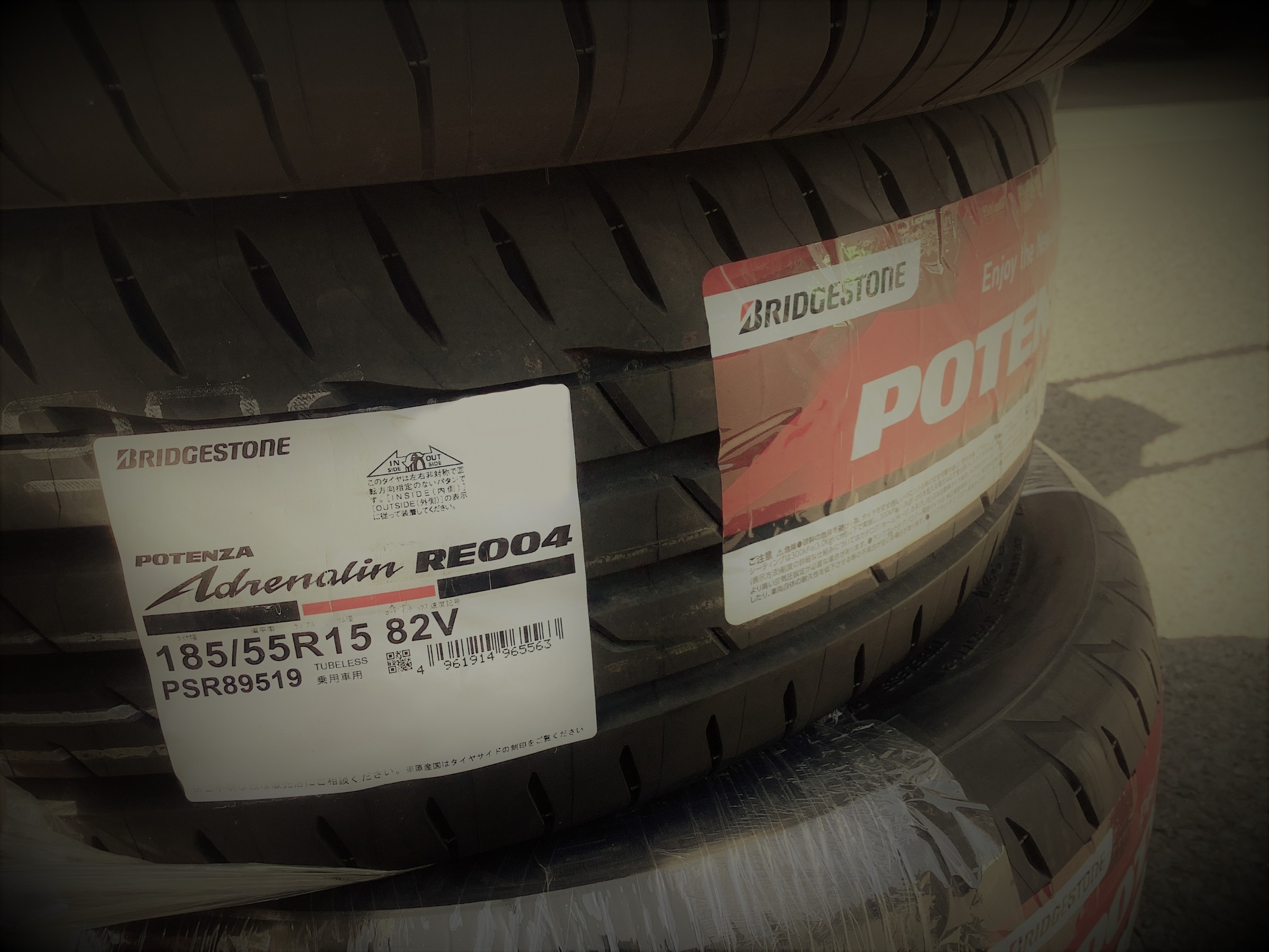 交換したタイヤは、ブリヂストンのPOTENZA Adrenalin RE004(ポテンザ アドレナリン アールイー ゼロ・ゼロ・フォー)185/55R15 !