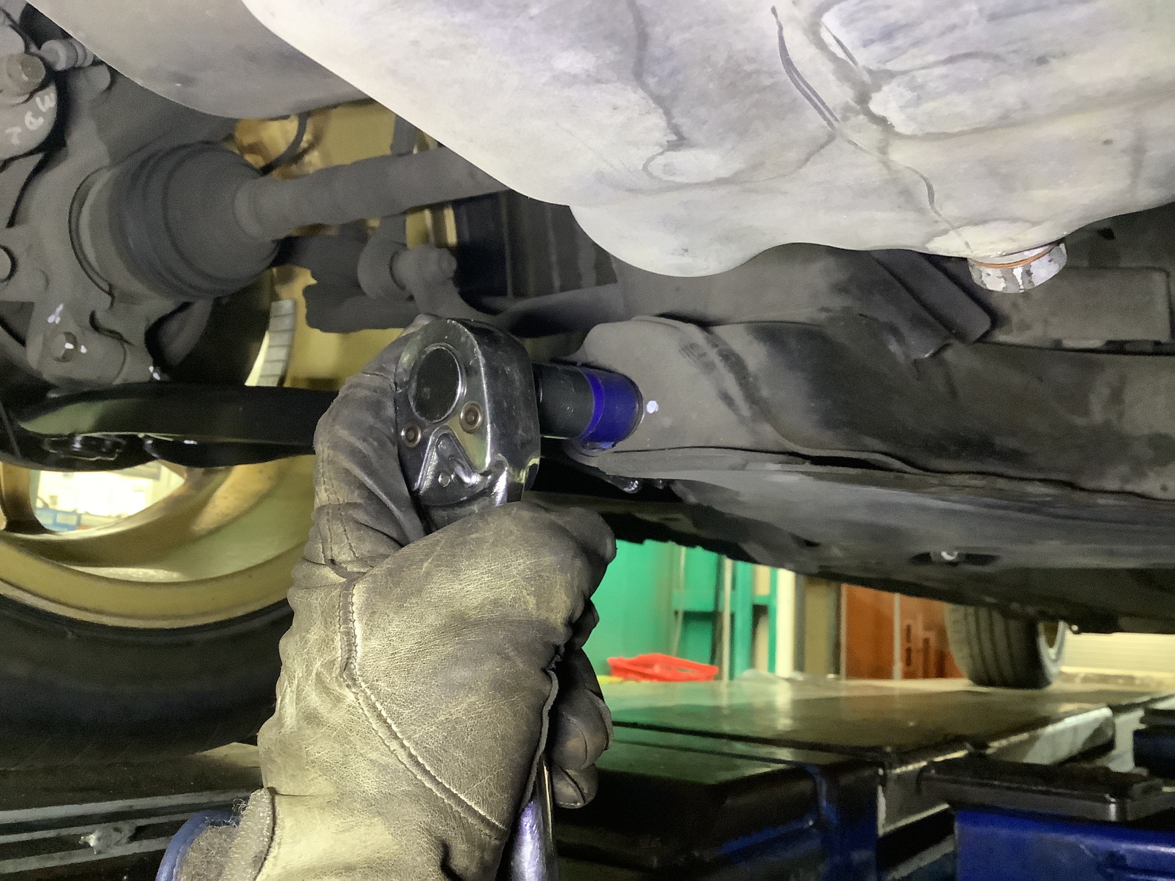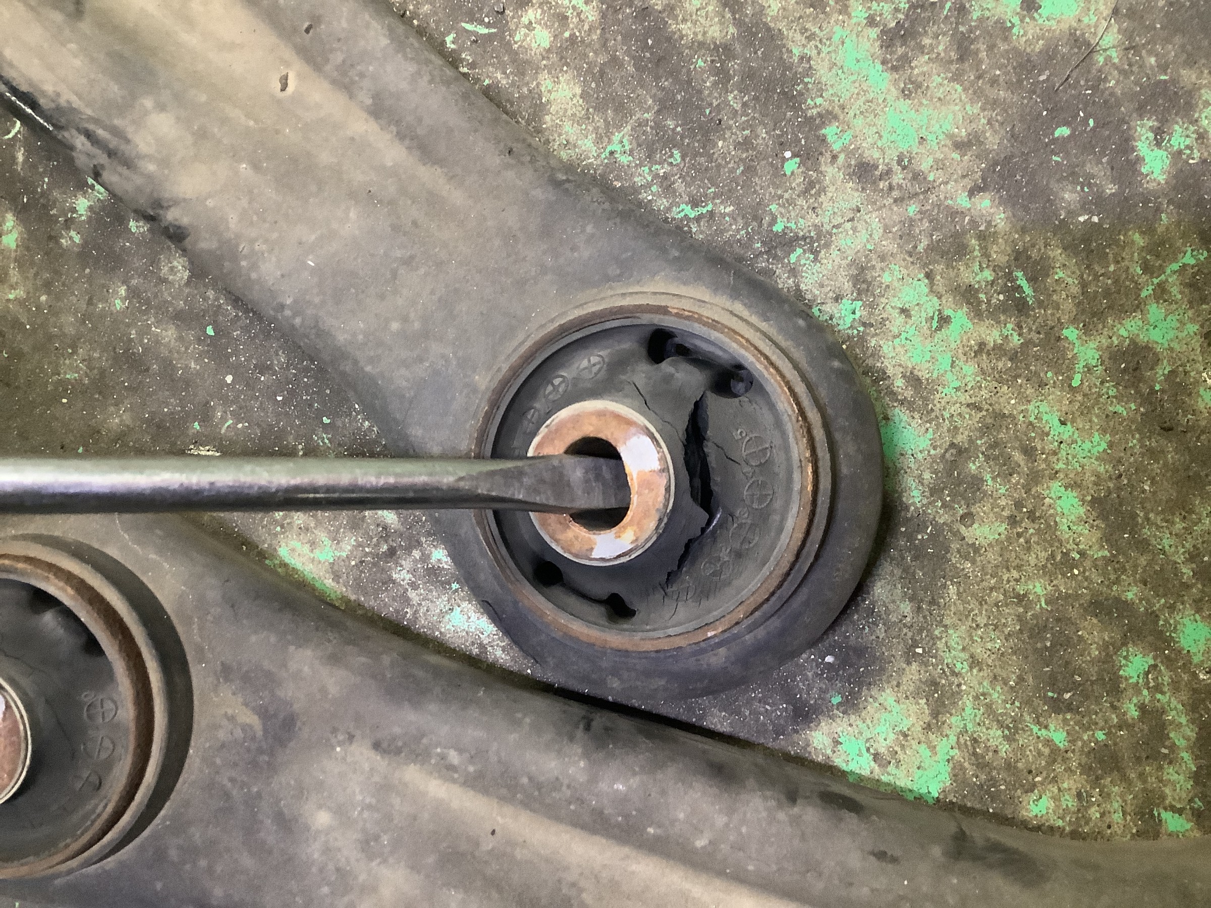 10万km超えの車体でサブフレームへ固定される部分のブッシュもガッツリ割れているので左右ともリフレッシュのために新品に交換しました( ,,`・ ω´・)