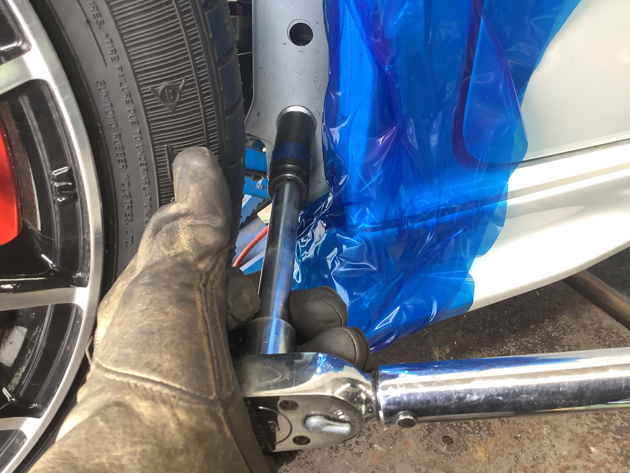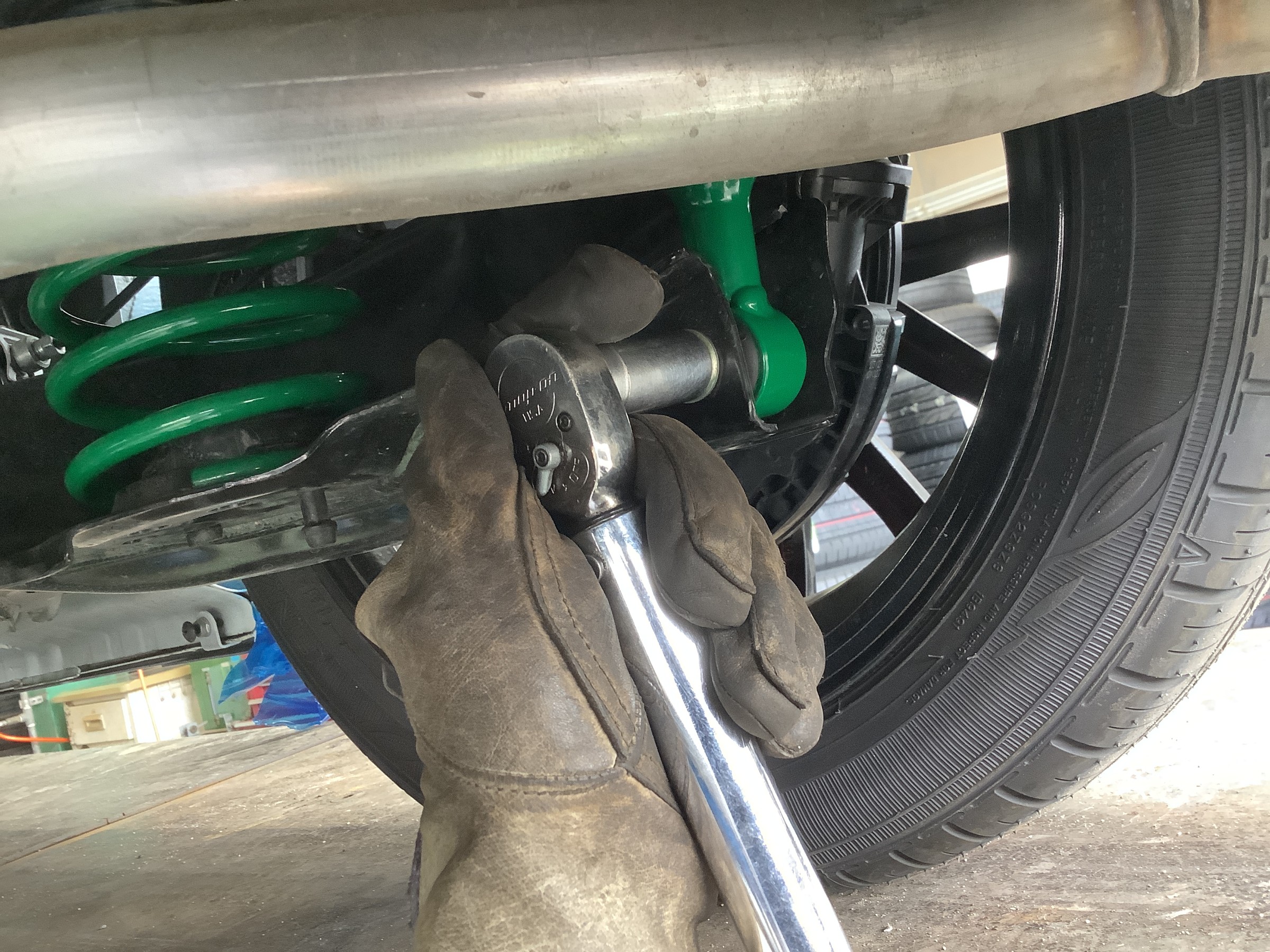 1G締めは疑似的に“タイヤを装着して接地させた状態”を作り出し、その状態で捻じれてしまっているブッシュのテンションを締めなおすことでアームブッシュのニュートラル位置を現状のローダウン状態に合わせてあげる作業ですヾ(゚д゚)ノ゛