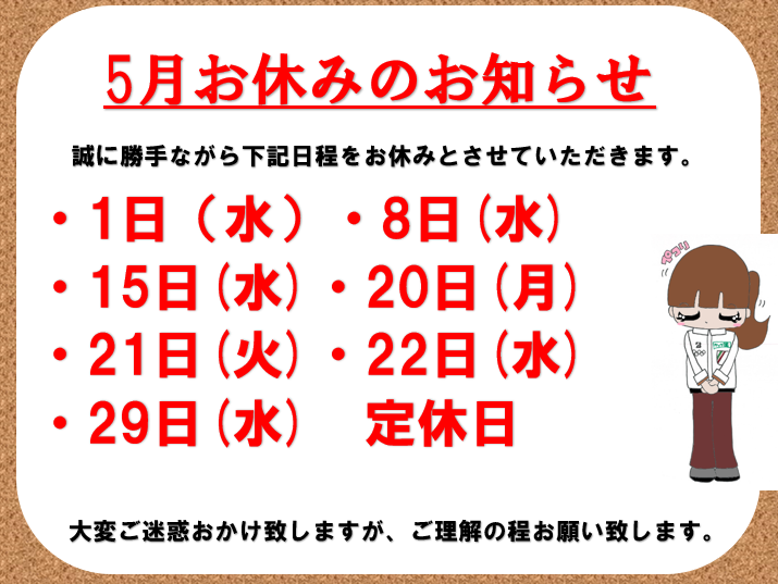 5月1日(水)含め、下記の日程が、お休みとなります。
