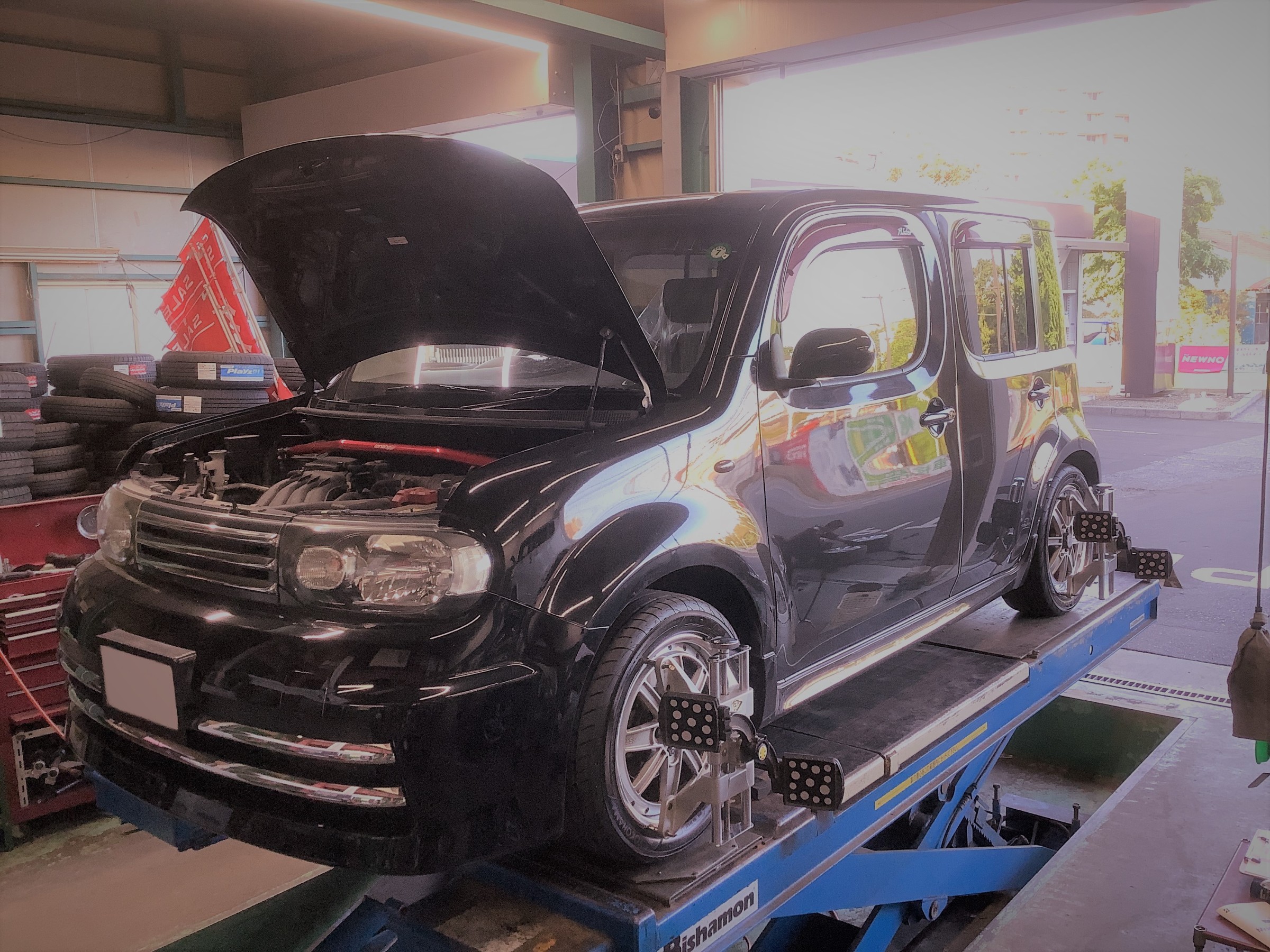 ピカピカの新タイヤを装着しているキューブくんの走行性能をしっかりと発揮&タイヤの摩耗の適正化をするため、ズレの発生しているタイヤの角度を補正させていただきました!