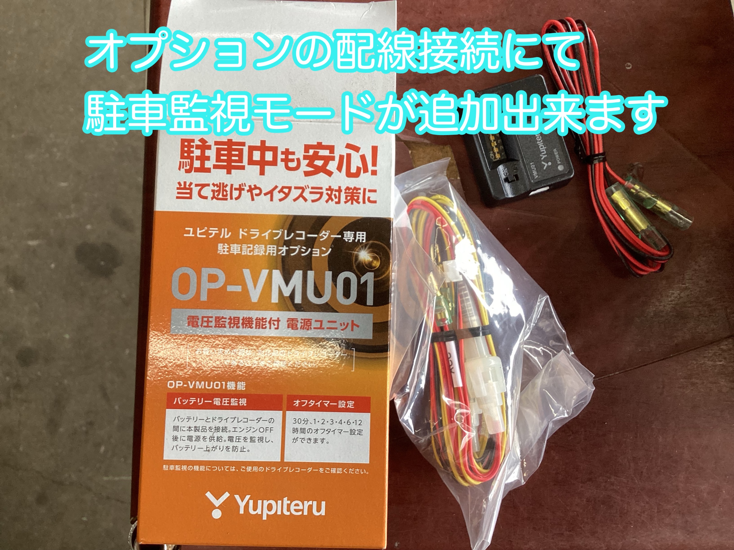 こちらの配線は常時電源を追加にて取り付け、駐車管理時間や待機電圧をスイッチにて設定出来ます