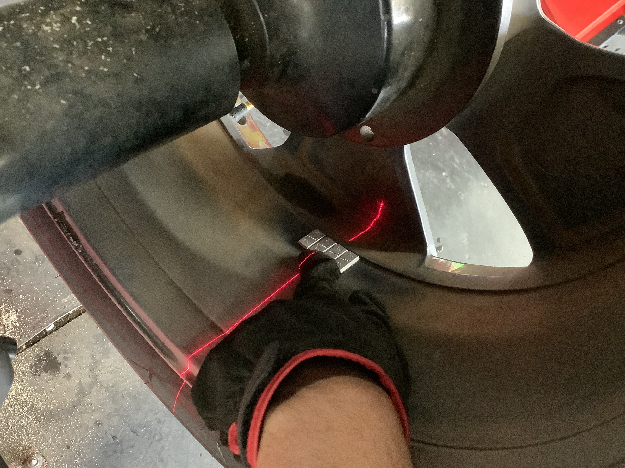 タイヤホイールを組付けすることによって発生するアンバランスは、専用のバランス測定器を使用して調整用の重りを貼り付けすることでハンドルのブレを軽減しますヾ(゚д゚)ノ゛