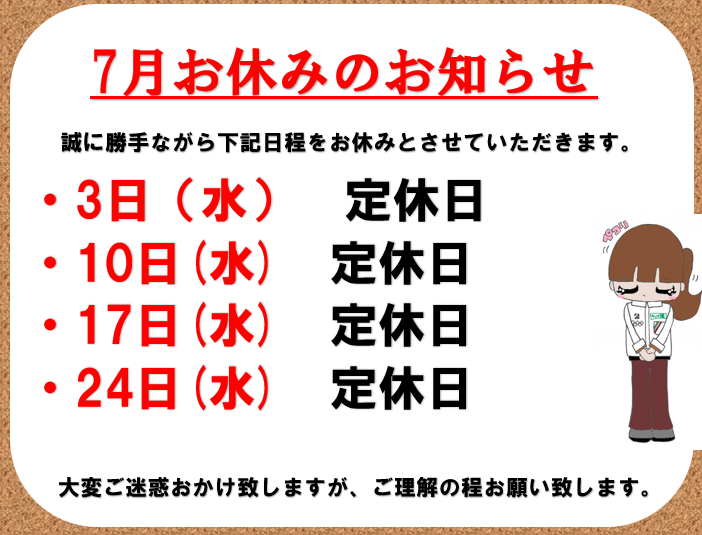 本日定休日となります。 ポスト 2024年7月17日 タイヤ館八千代店のホームページをご覧いただきありがとうございます。 本日7月17日(水)は、定休日となります。 ご利用のお客様に置かれましては、 ご迷惑おかけいたしますが、何卒ご理解ご了承の程お願い申し上げます。 タイヤ館 八千代 住所:276-0046千葉県八千代市大和田新田988-6 電話番号: 047-458-1777 相談予約 タイヤ点検・安全点検/タイヤ履き替え/オイル交換/その他ピット作業の予約