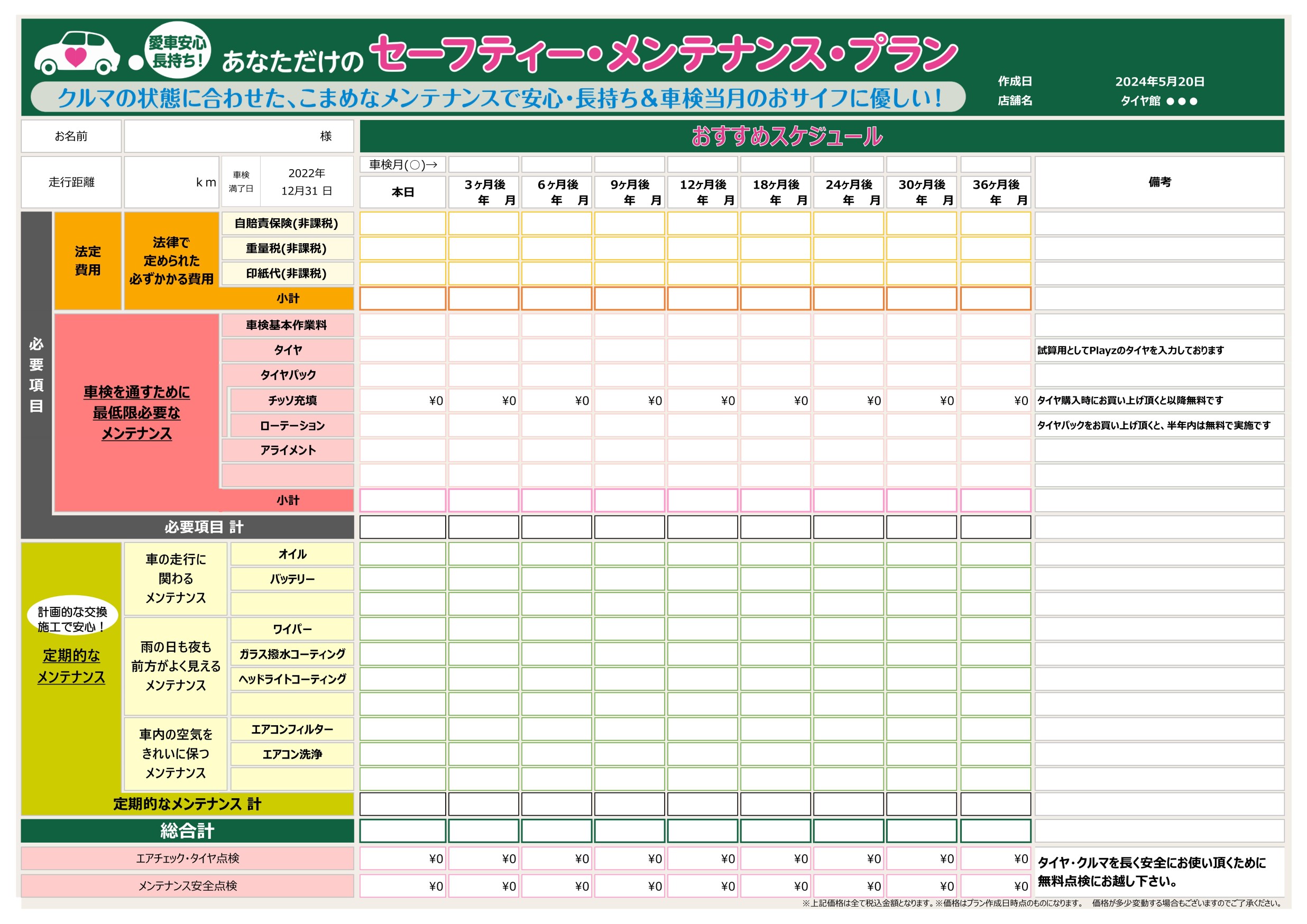 タイヤ館では、適切なタイミングで、こまめにメンテナンスすることで、車検時のまとまった負担を避ける為、お財布に優しいメンテナンスプランをご用意しております。