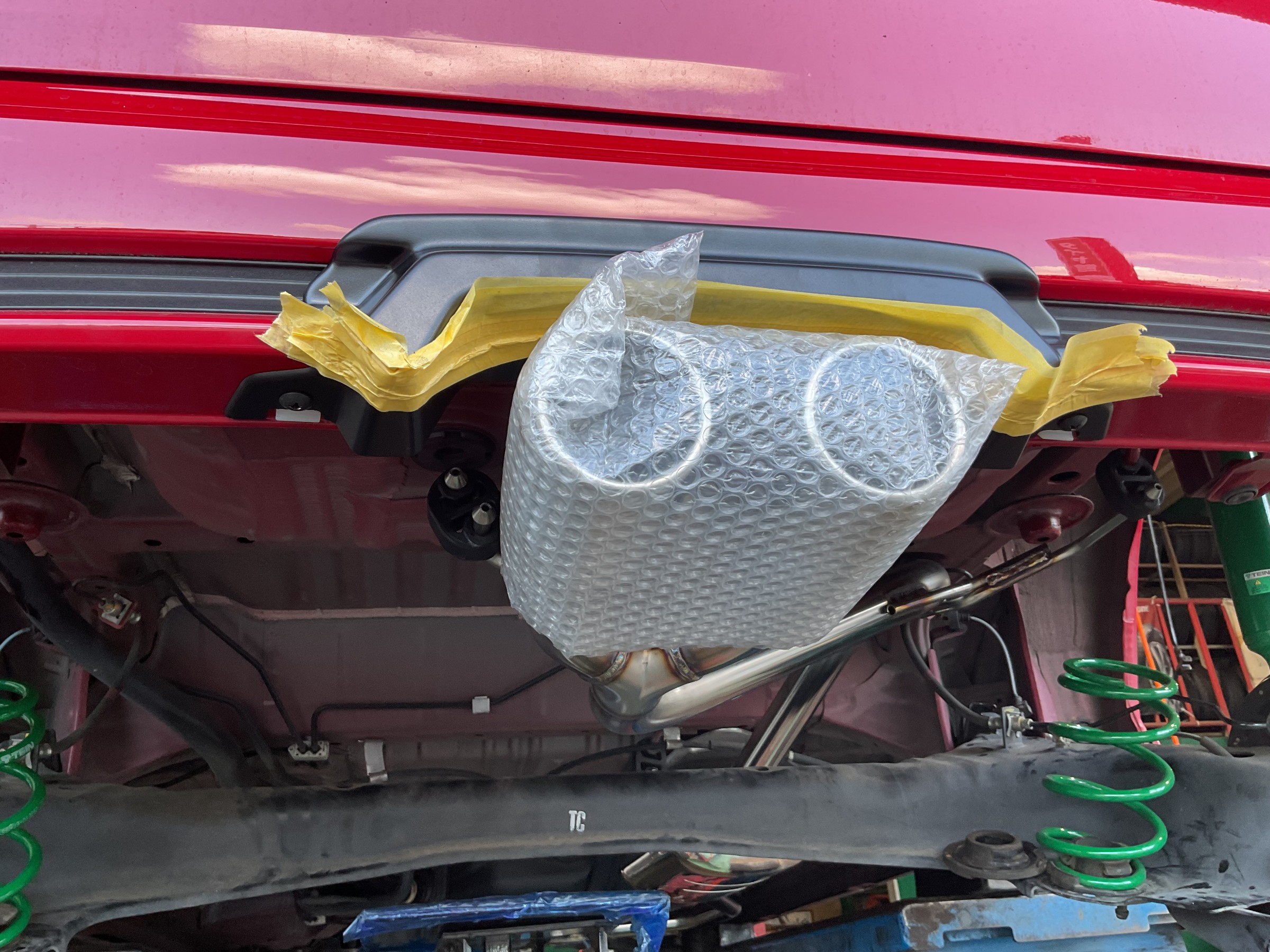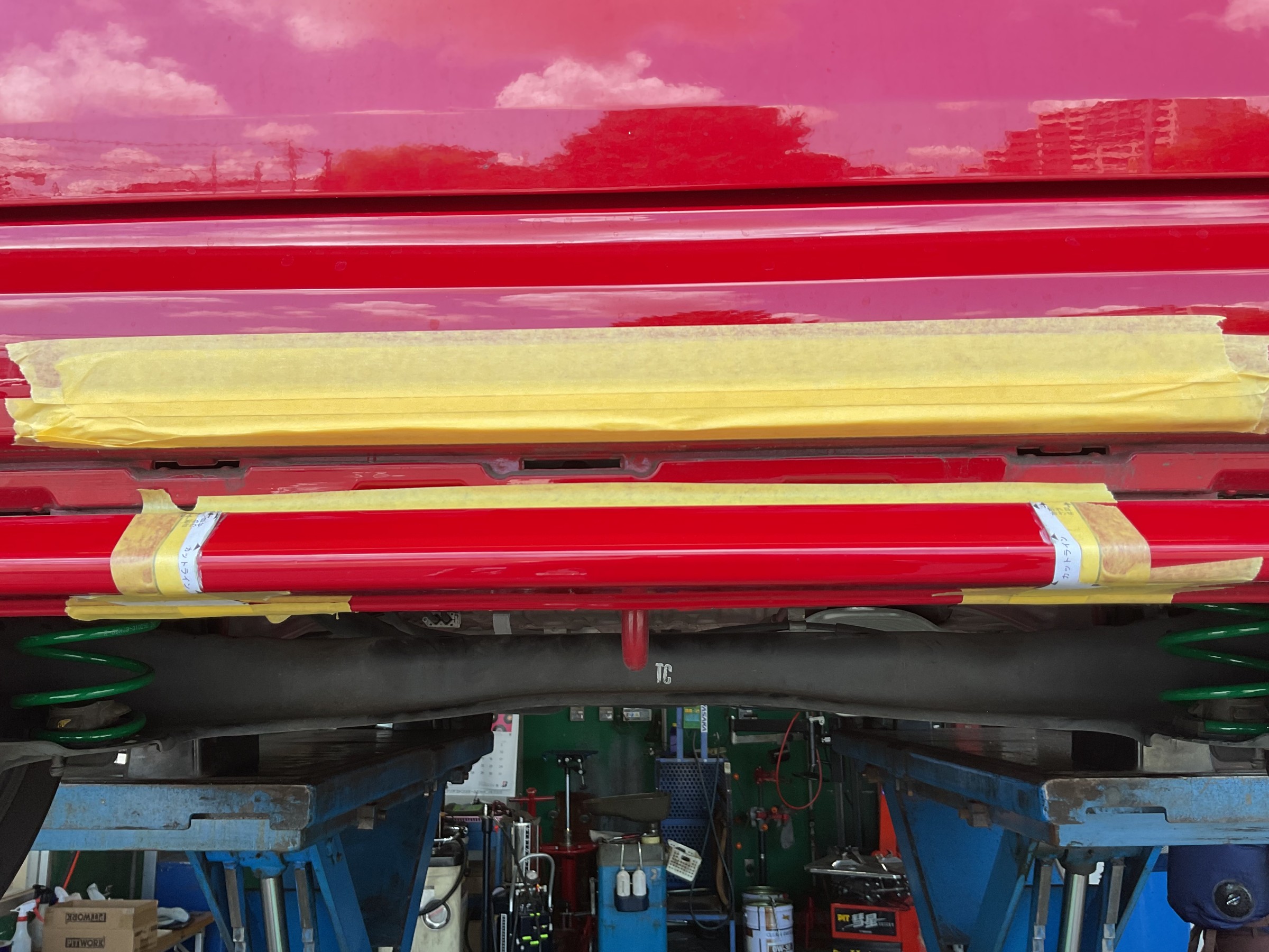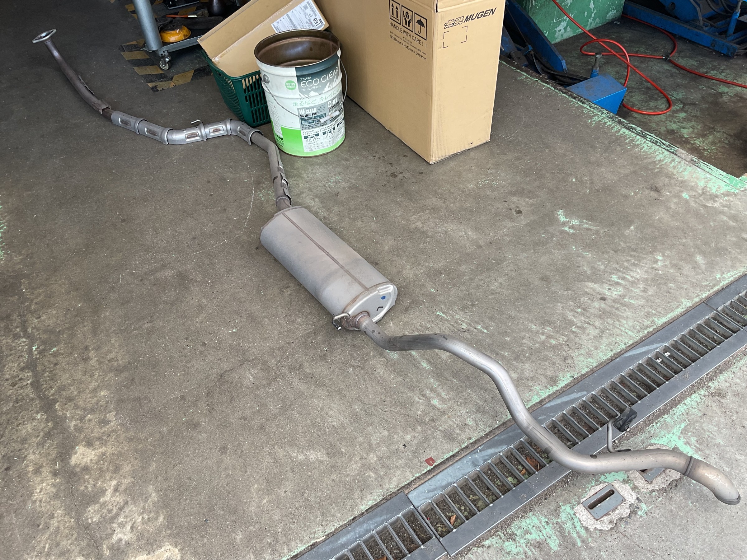 ローダウンしているからか、ショックを外してトーションビームを下げないとマフラーが入りませんでした(;^ω^)