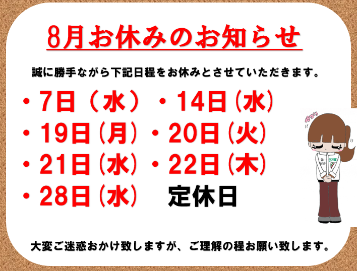 本日8月14日(水)定休日となります。