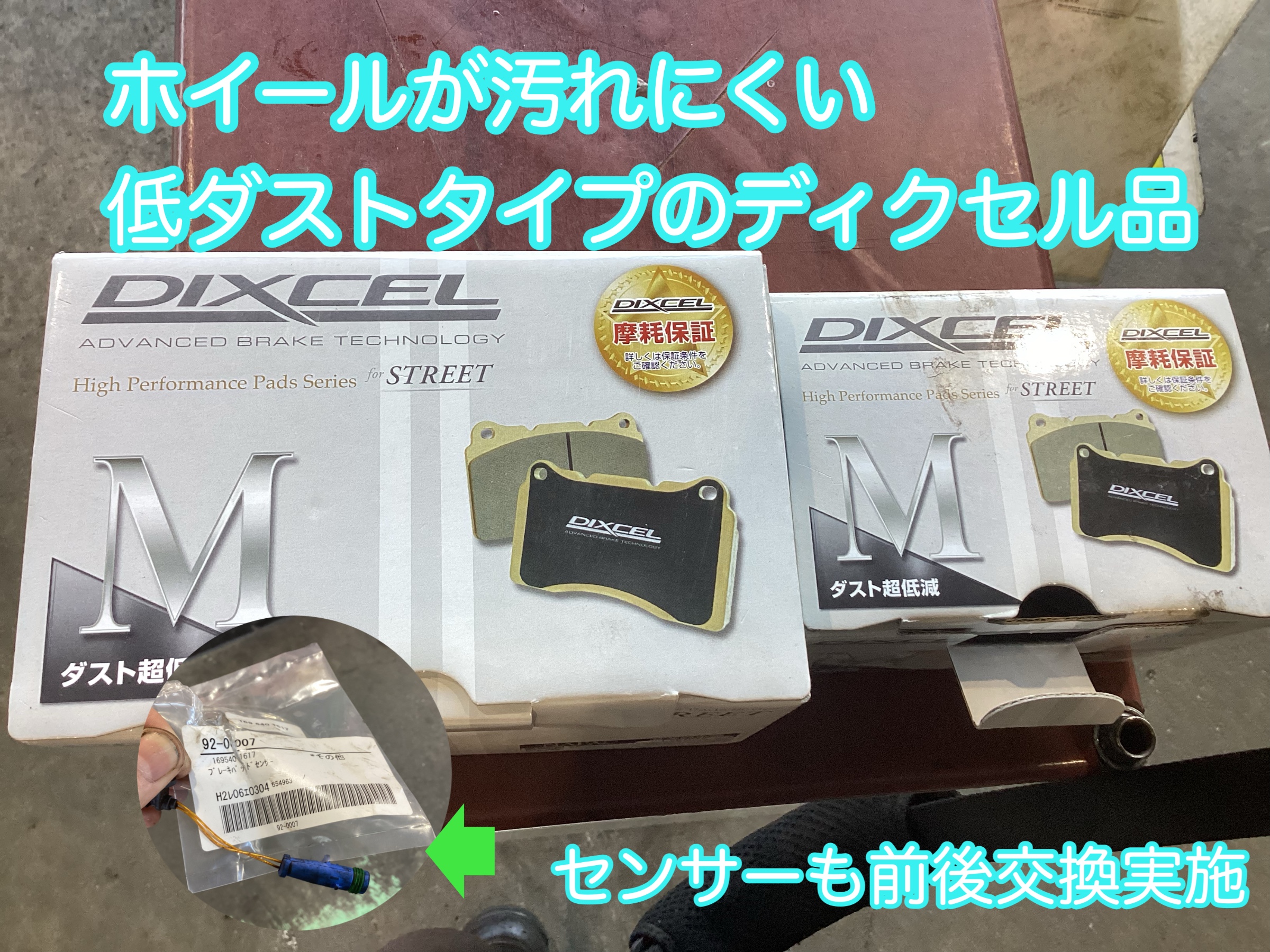 輸入車はセンサー付きが多く同時に交換いたします。ローターは状態が良かった為今回は交換無しにて。