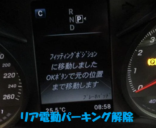 リアは電動パーキング式の為解除が必要です。メルセデス・ベンツはOBD診断機が無くても室内のボタンから設定にて