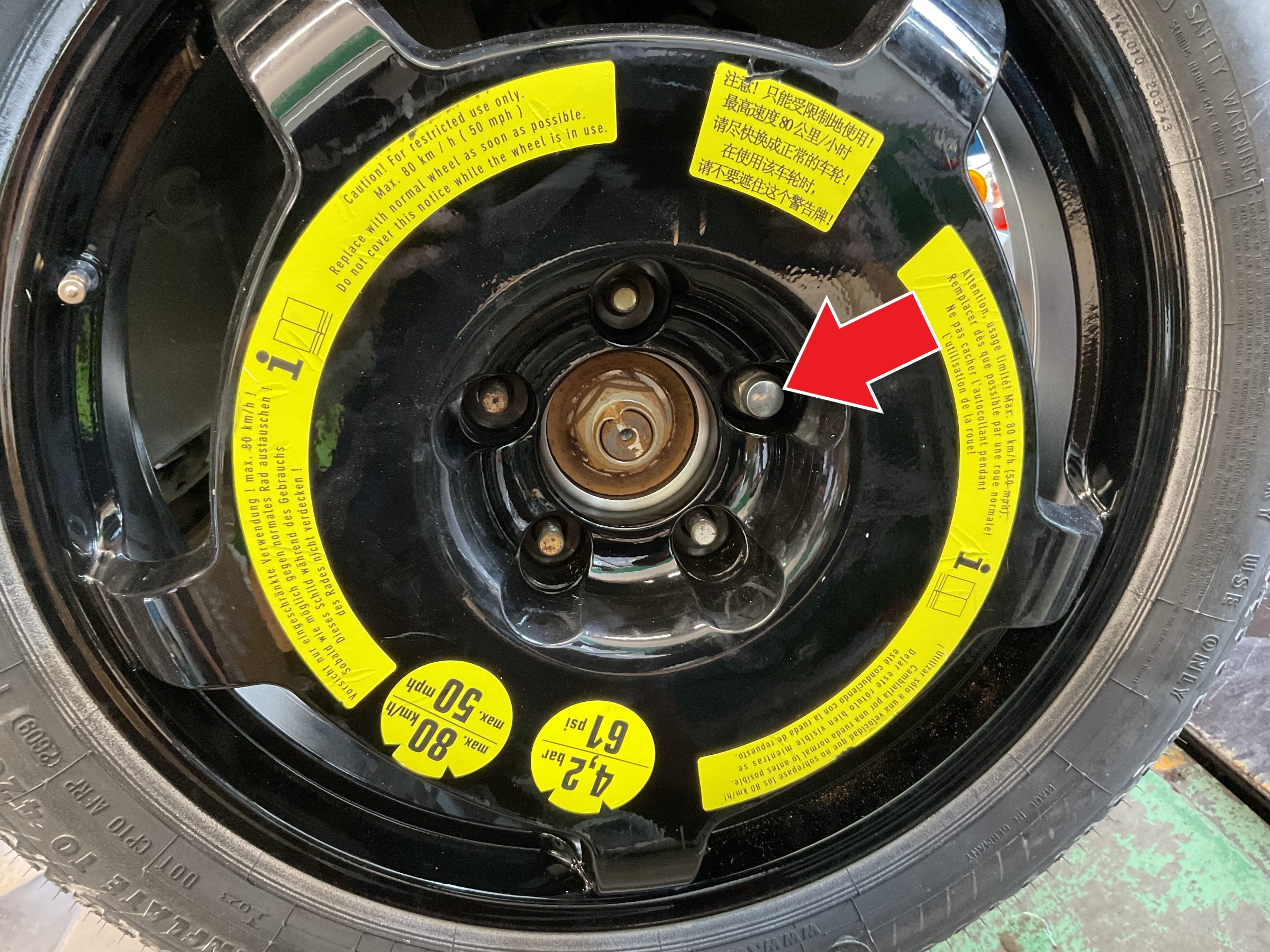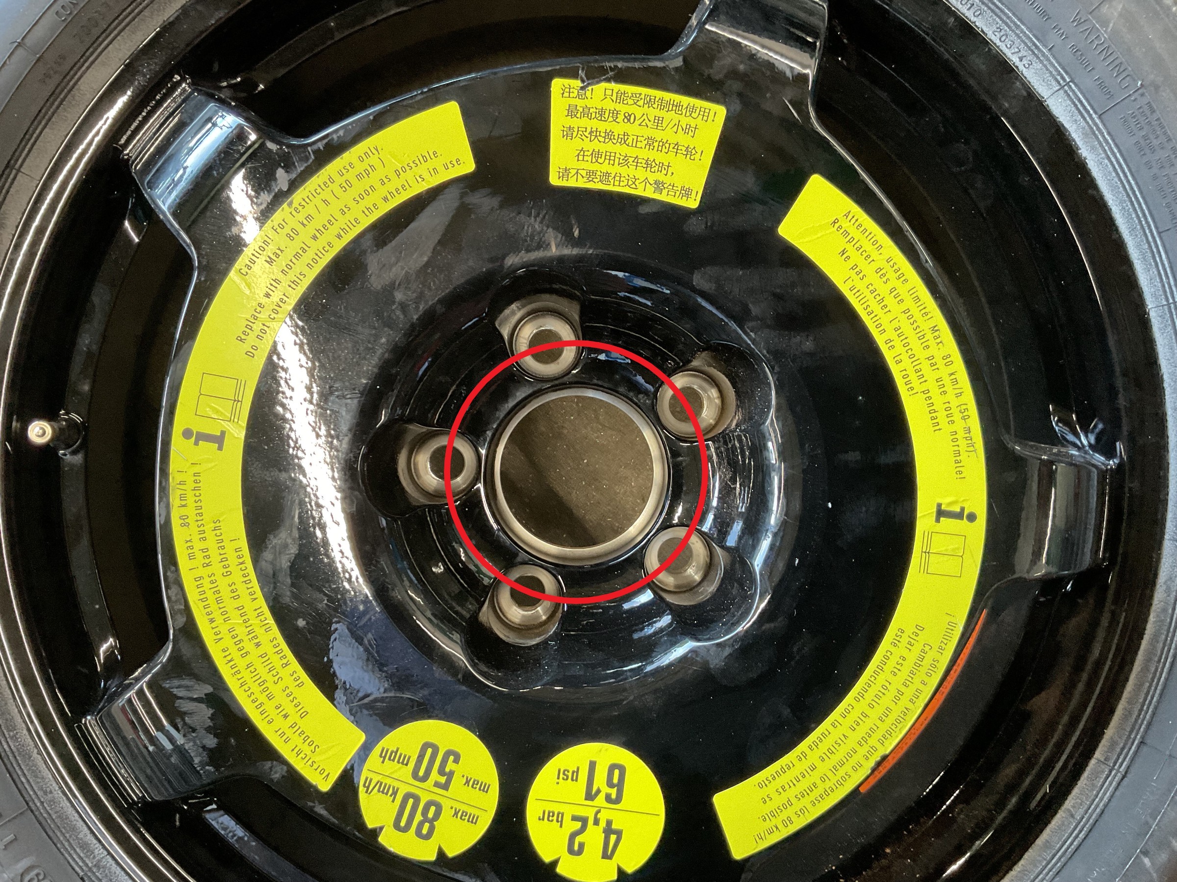他車種のスペアタイヤを使用する際の注意点ですが、タイヤサイズはもちろんなのですが↑で赤丸で示しているハブ径も重要です!