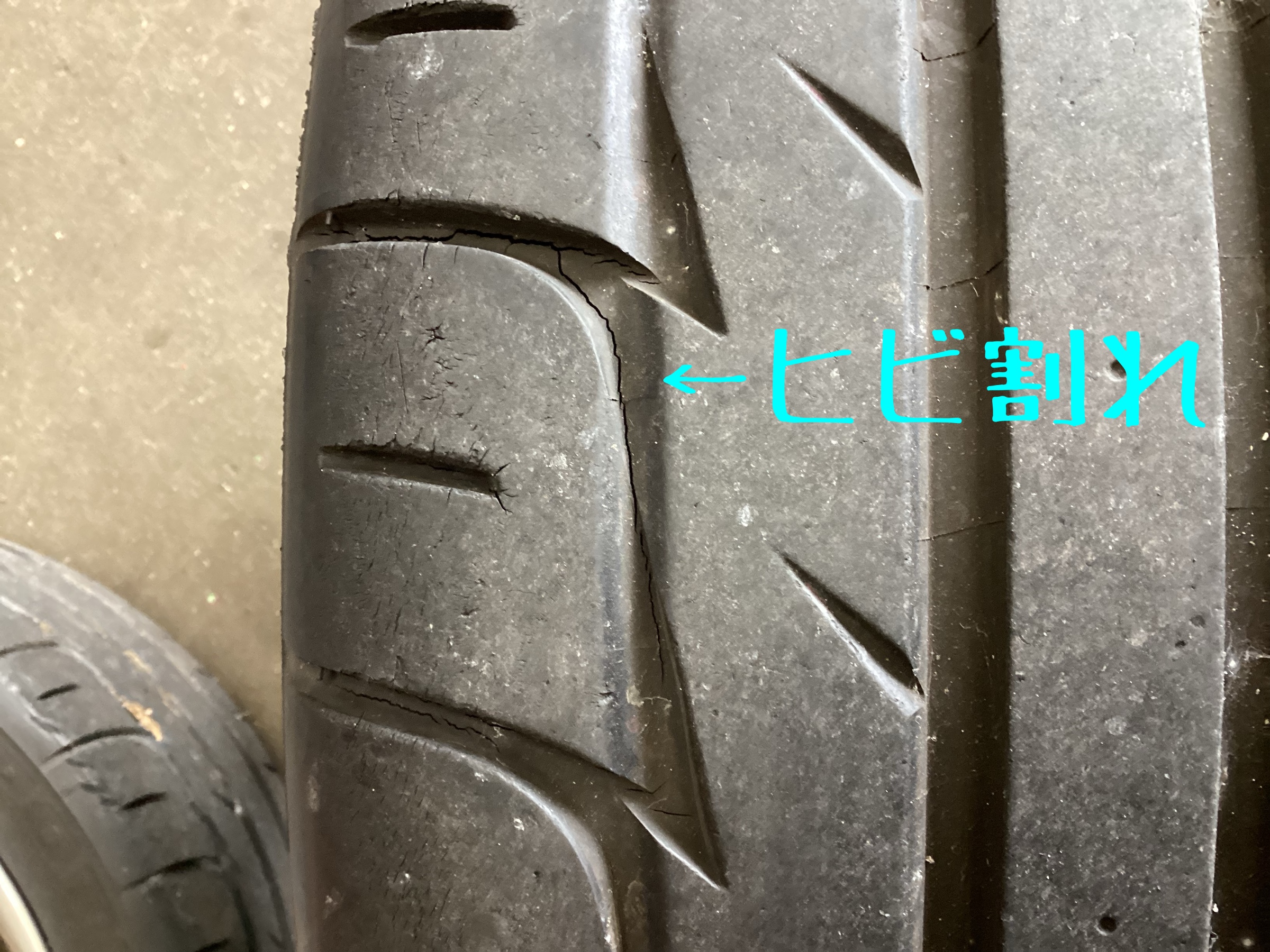 セカンドカーでほとんど動かさなかったらしく、溝はたんまり残っています。が、14年前のタイヤなので、ヒビが大変な事になってます。