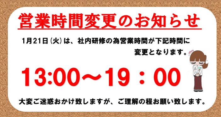 1月21日(火)営業時間変更のお知らせ ポスト 2025年1月19日 タイヤ館八千代店のホームページをご覧いただき誠にありがとうございます。 1月21日(火)は、社内研修の為、営業時間が変更になります。 ご利用のお客様におかれましては、ご迷惑おかけいたしますが、 何卒ご理解ご了承の程お願い申し上げます。 タイヤ館 八千代 住所:276-0046千葉県八千代市大和田新田988-6 電話番号: 047-458-1777 相談予約 タイヤ点検・安全点検/タイヤ履き替え/オイル交換/その他ピット作業の予約