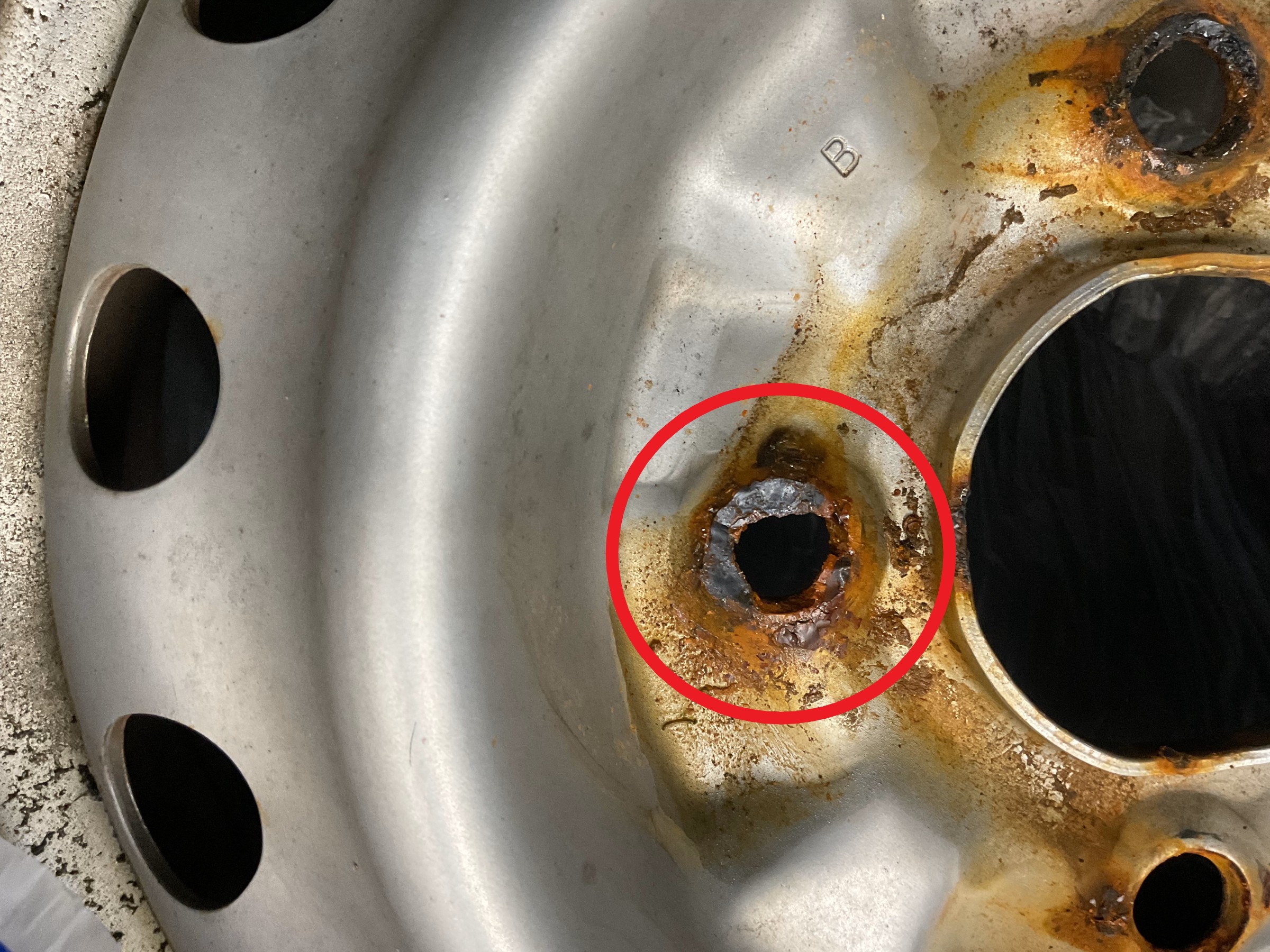このように“ナットで締め付けして車に固定する部分“がサビで変形している状態を無視して車に装着すると、