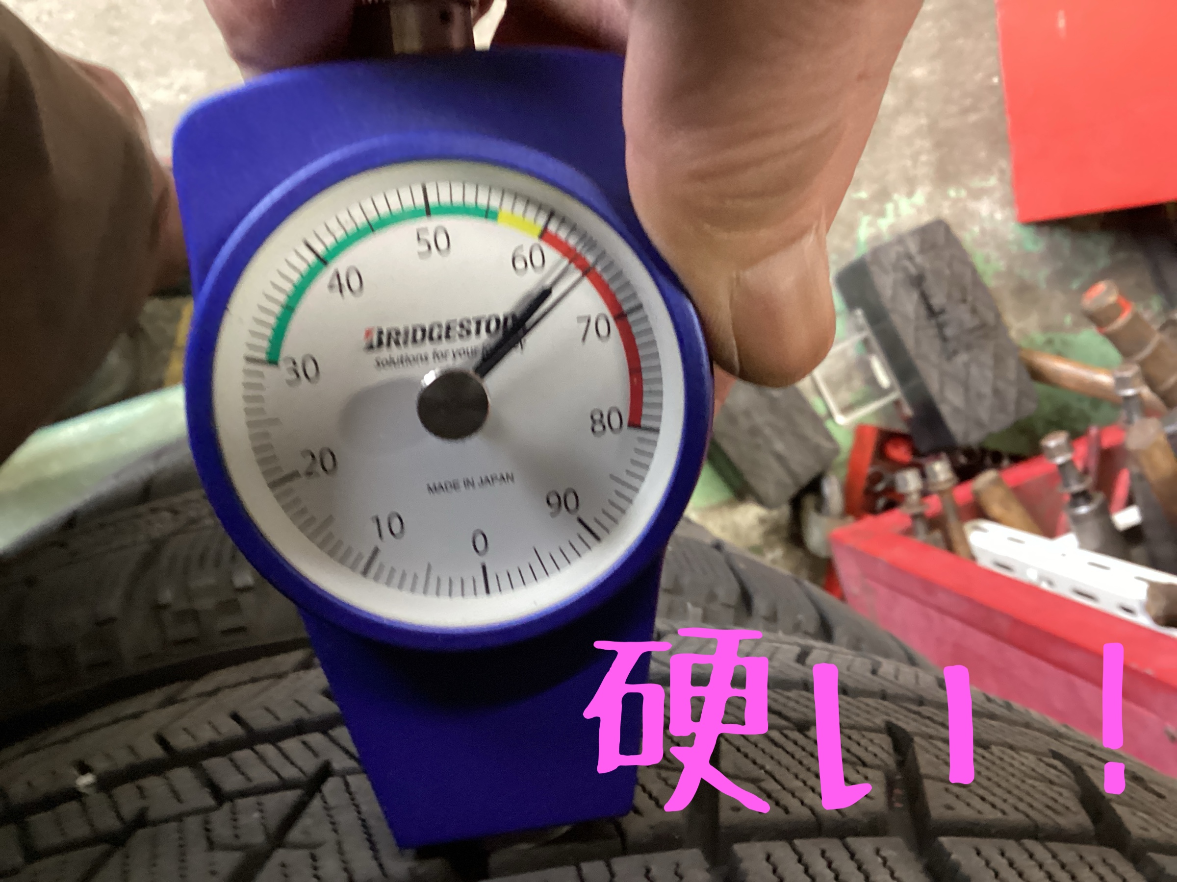 スタッドレスタイヤの硬さを測る専用の機器、硬度計を使って硬さを測ると、針が赤い所をさしています。