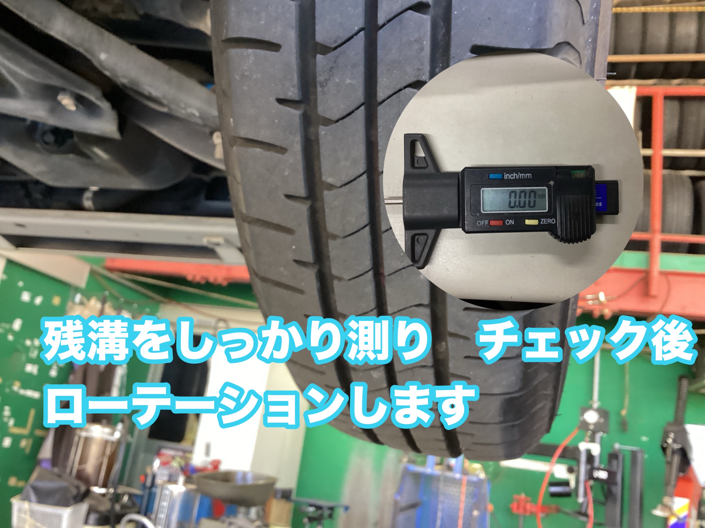 早くすり減りますのでタイヤの溝が前後で1ミリ以上差が出始めたらローテーションを行いましょう。