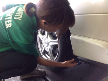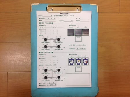 タイヤチェックシートという用紙に、今履かれているタイヤの情報、ミゾ、ヒビ、キズの有無、偏磨耗の有無を記入してお客様にご報告(^O^)/