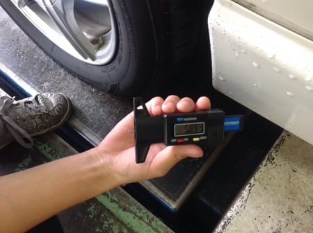 デプスゲージというタイヤのミゾを測る専用の道具で前後のミゾの差がないか測ります!