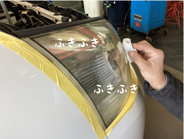 まずは、液剤が、ガラス部分以外に流れ込まないように、マスキングテープでしっかりと保護をしていきます!