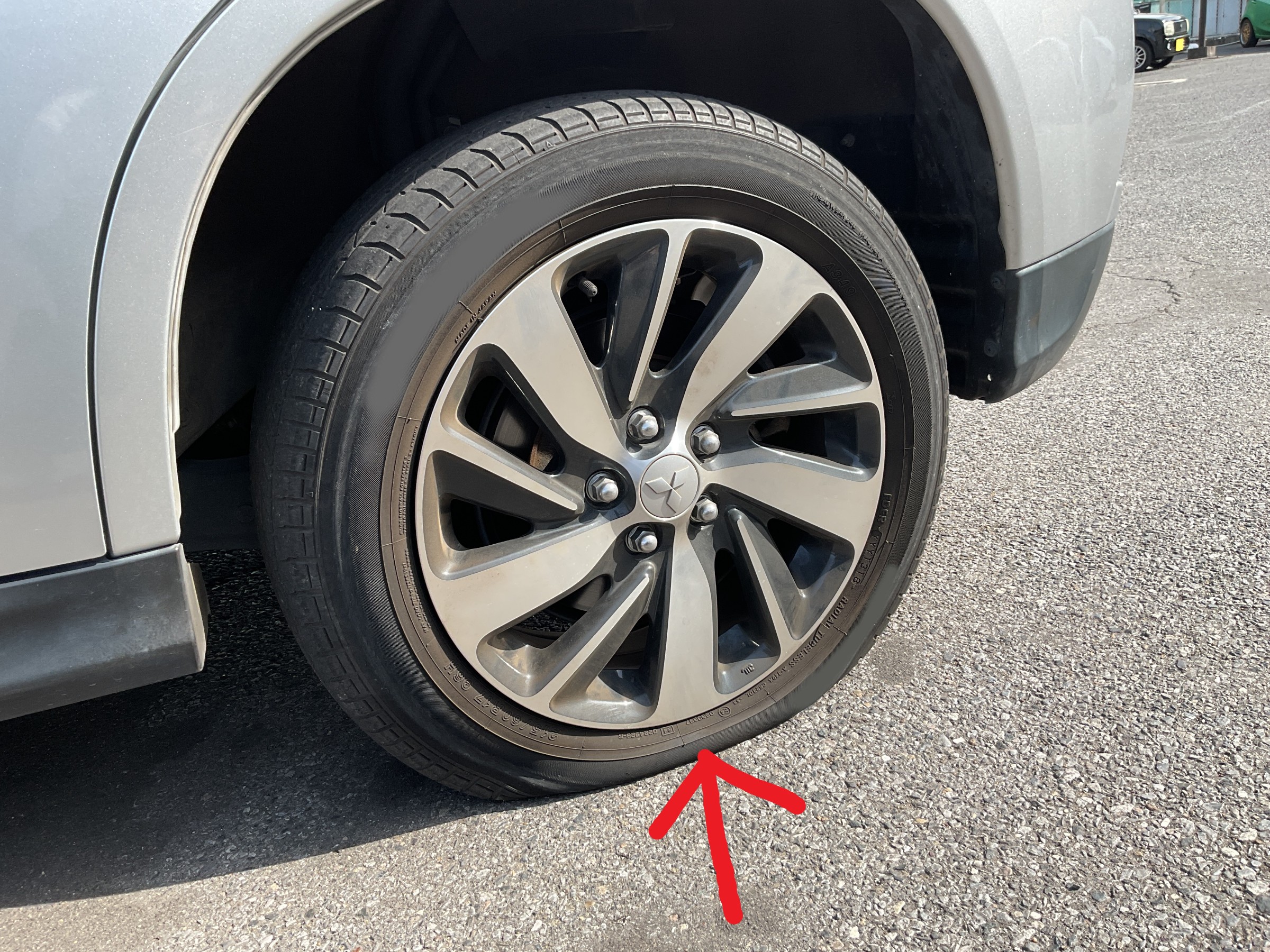 クギのようなものが刺さっており、つぶれた状態で走行していたためにタイヤの側面が損傷していて交換が必要な状態になっておりました(・_・;)
