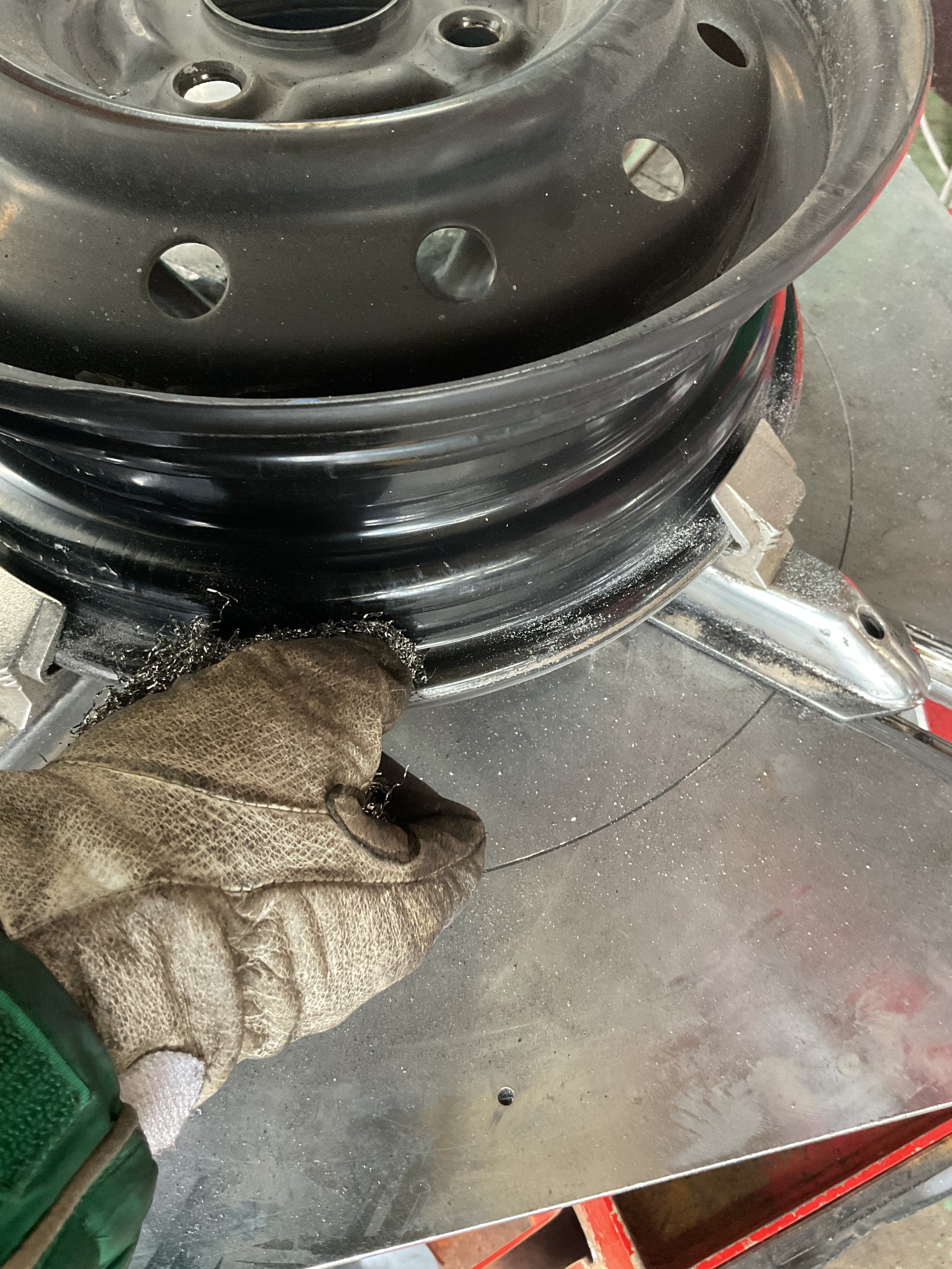 古いタイヤを外したら、エア漏れの原因となる汚れの除去の為にタイヤとホイールの接触面を磨く&エアバルブも新品に交換!
