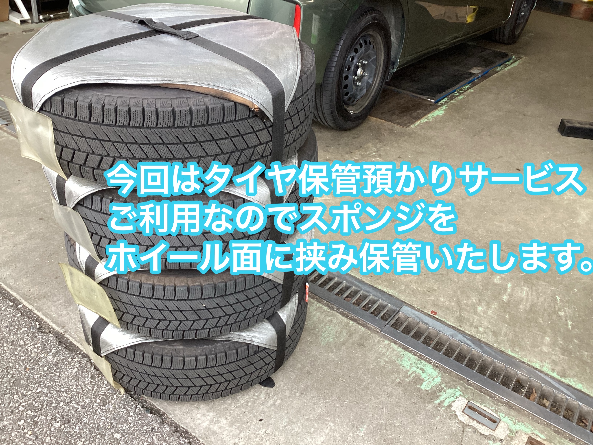 タイヤ保管サービスも実施しておりタイヤの大きさにて1年間sサイズLサイズの保管料が分かれて