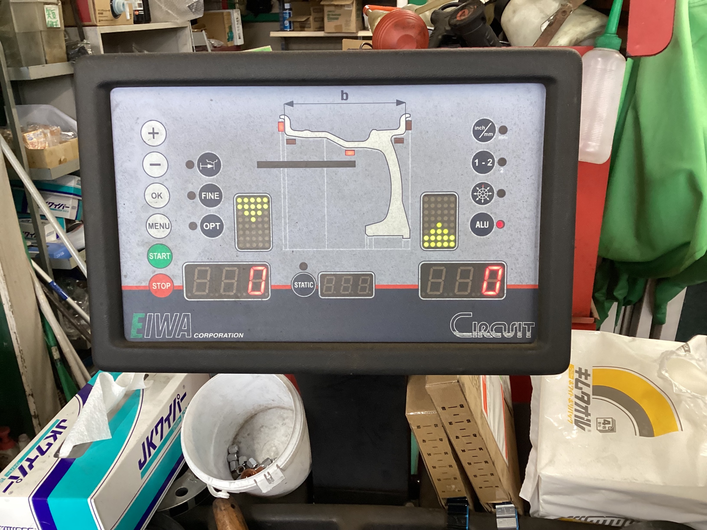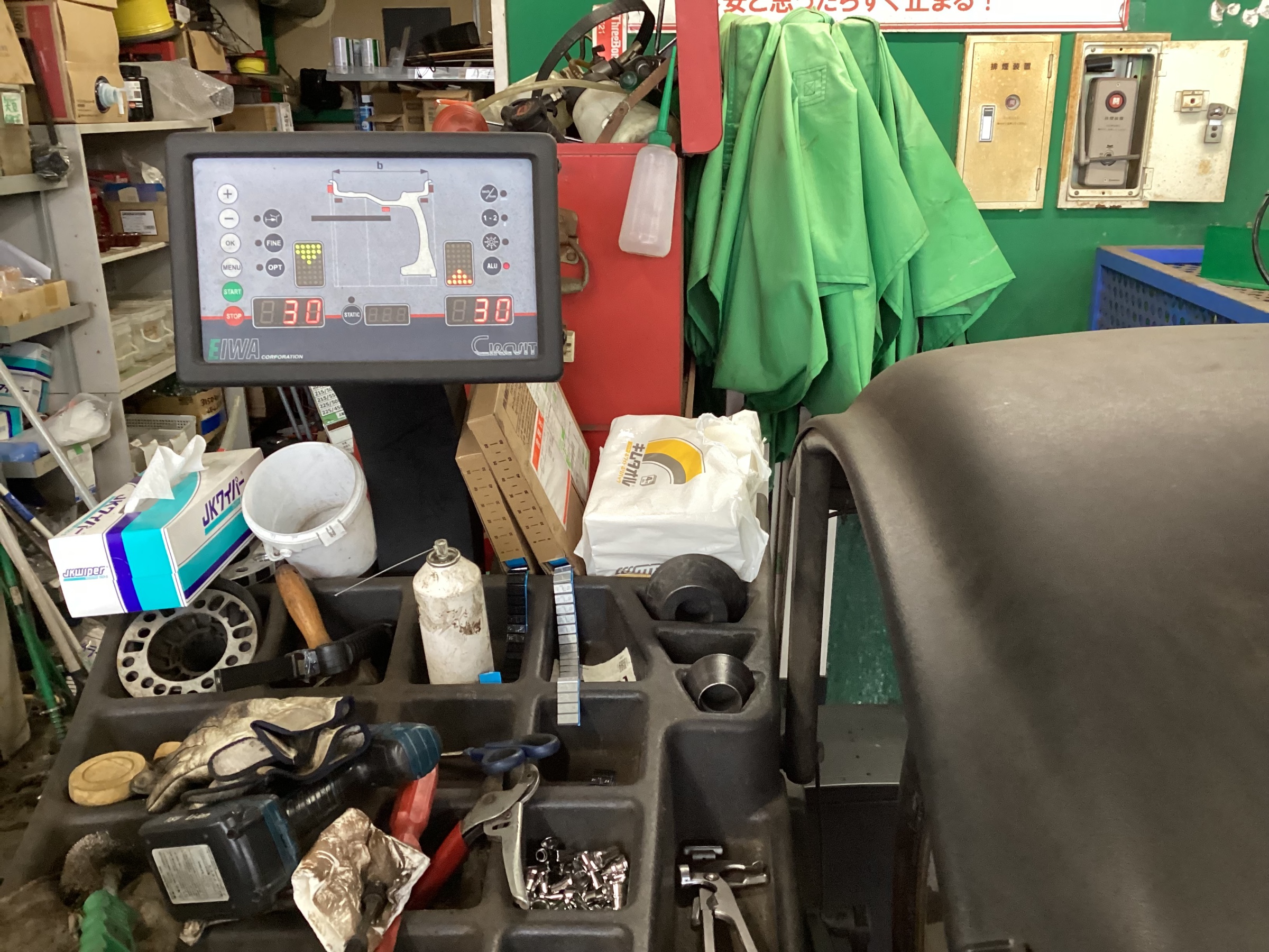 アンバランスを測定します。画面の左右に30と表示されています。これは、外側、内側共に30gのアンバランスがあることを指します。この状態だと、高速走行時にハンドルのブレが発生してしまうので、バランスウエイトを取り付けて調整します。