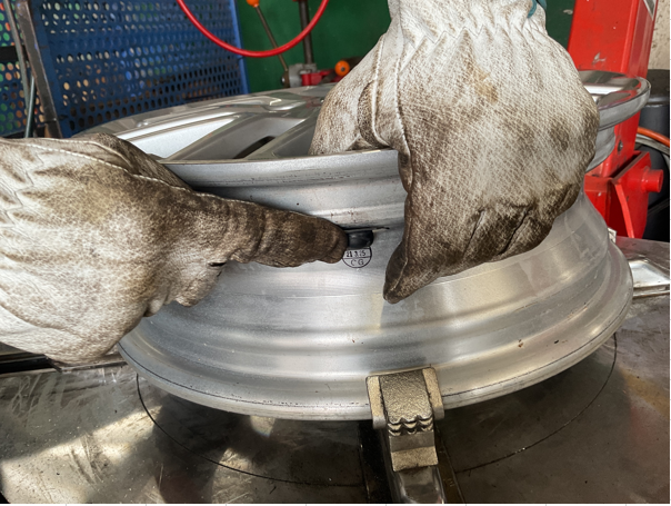 新品タイヤをホイールに組み込んでいきます。