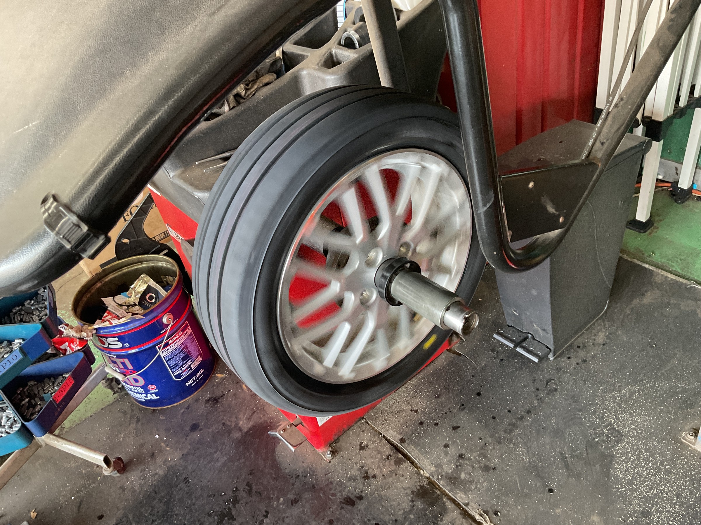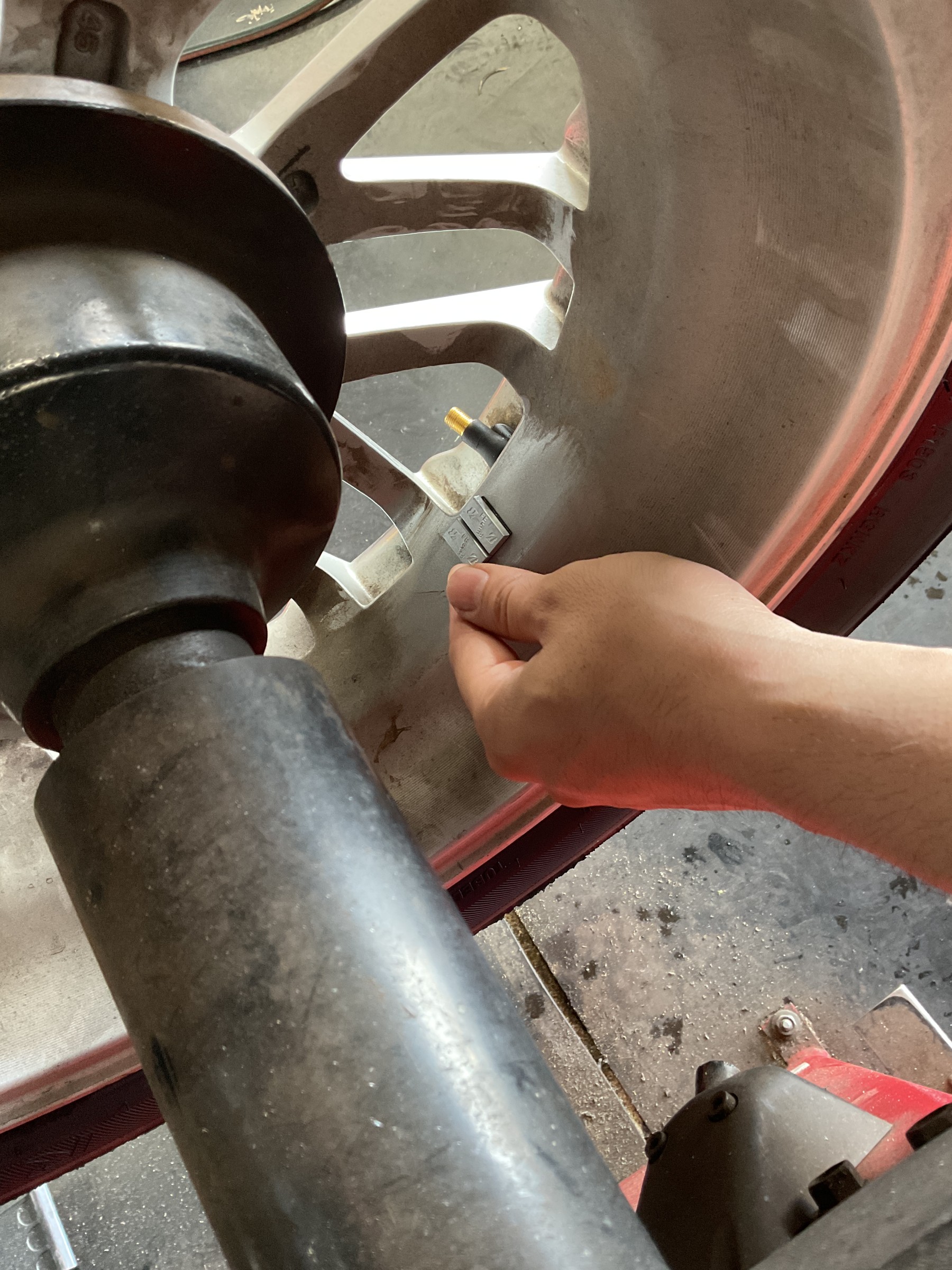 ホイールのバランスも大切です。重りを貼り付けていきます。