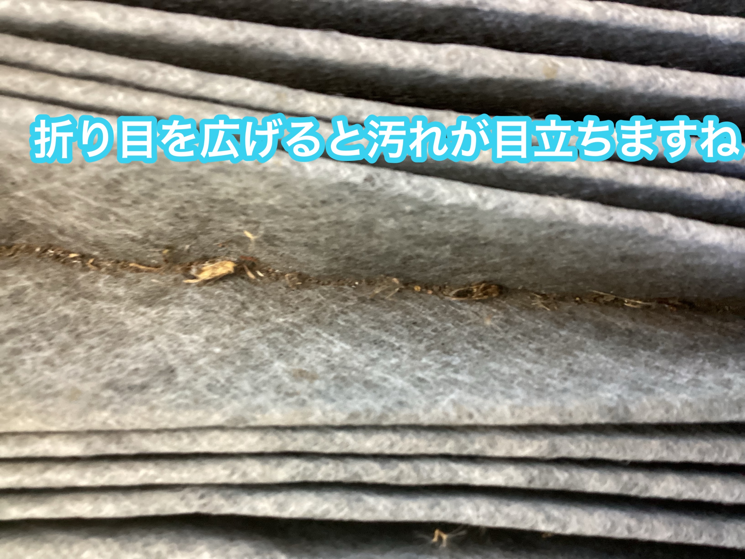 折り目には埃やゴミ、花粉などが目詰まりして来ていますね、放っておくと臭いの元となります