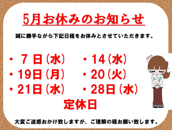 本日、5月7日(水)は定休日となります。 ポスト 2025年5月7日 タイヤ館八千代のホームページをご覧いただき誠にありがとうございます。 当店、定休日のご案内です!! 5月7日(水)は、定休日となります。 ご利用のお客様に置かれましては、ご迷惑おかけいたしますが、 何卒ご理解ご了承の程お願い申し上げます。 現在ご予約は、WEBからもお取り頂けますので、 そちらもぜひ、ご利用ください(^_-)-☆ タイヤ館 八千代 住所:276-0046千葉県八千代市大和田新田988-6 電話番号: 047-458-1777 相談予約 タイヤ点検・安全点検/タイヤ履き替え/オイル交換/その他ピット作業の予約