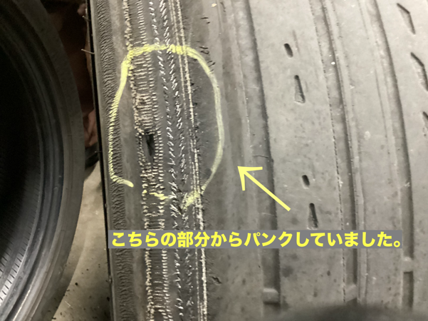 パンクがあるとのことでご来店されたのですが、タイヤの内側からワイヤーが出ていて、こちらの部分から、エアーが漏れていました。