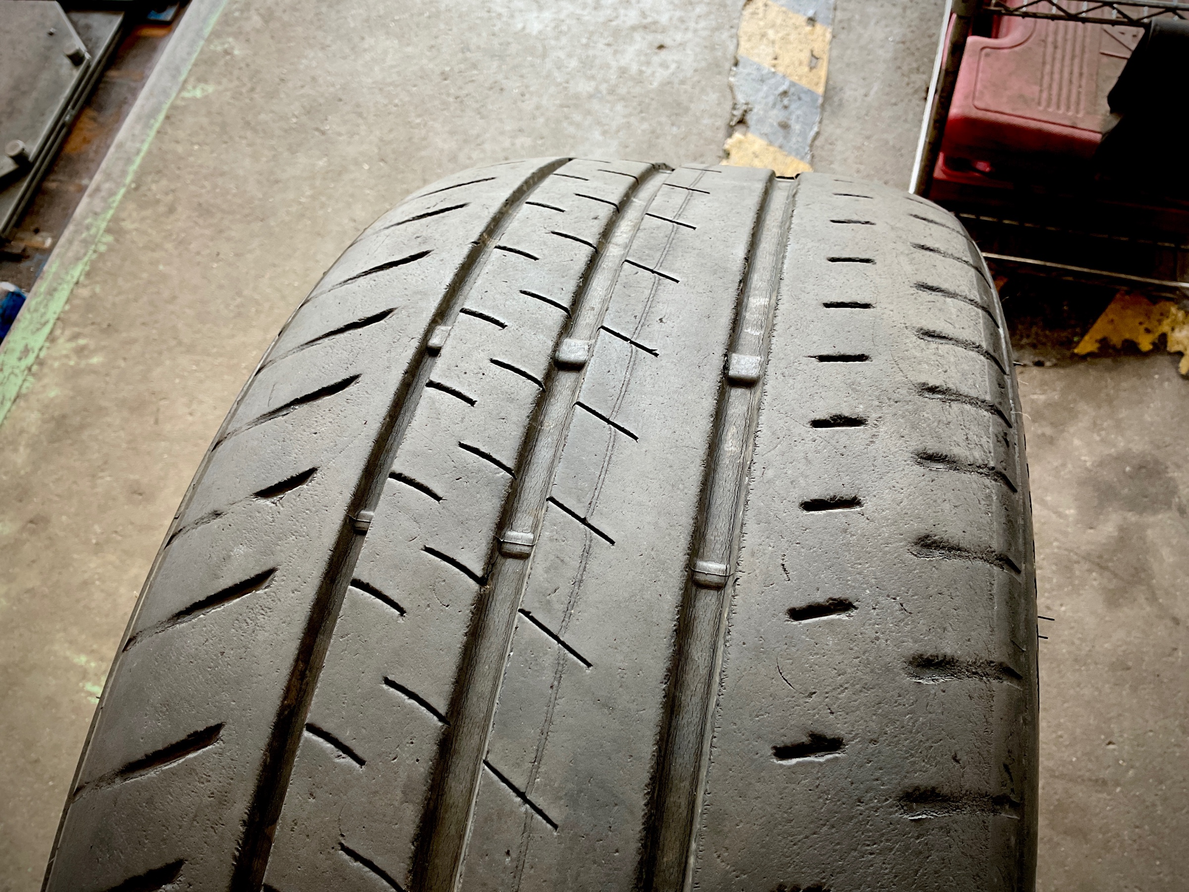 今までお使いいただいていたタイヤは新車装着のタイヤですが、走行距離を重ね摩耗が進んだことで溝が浅くなっており、ゴムの経年劣化でのヒビ割れも見られるような状態です。