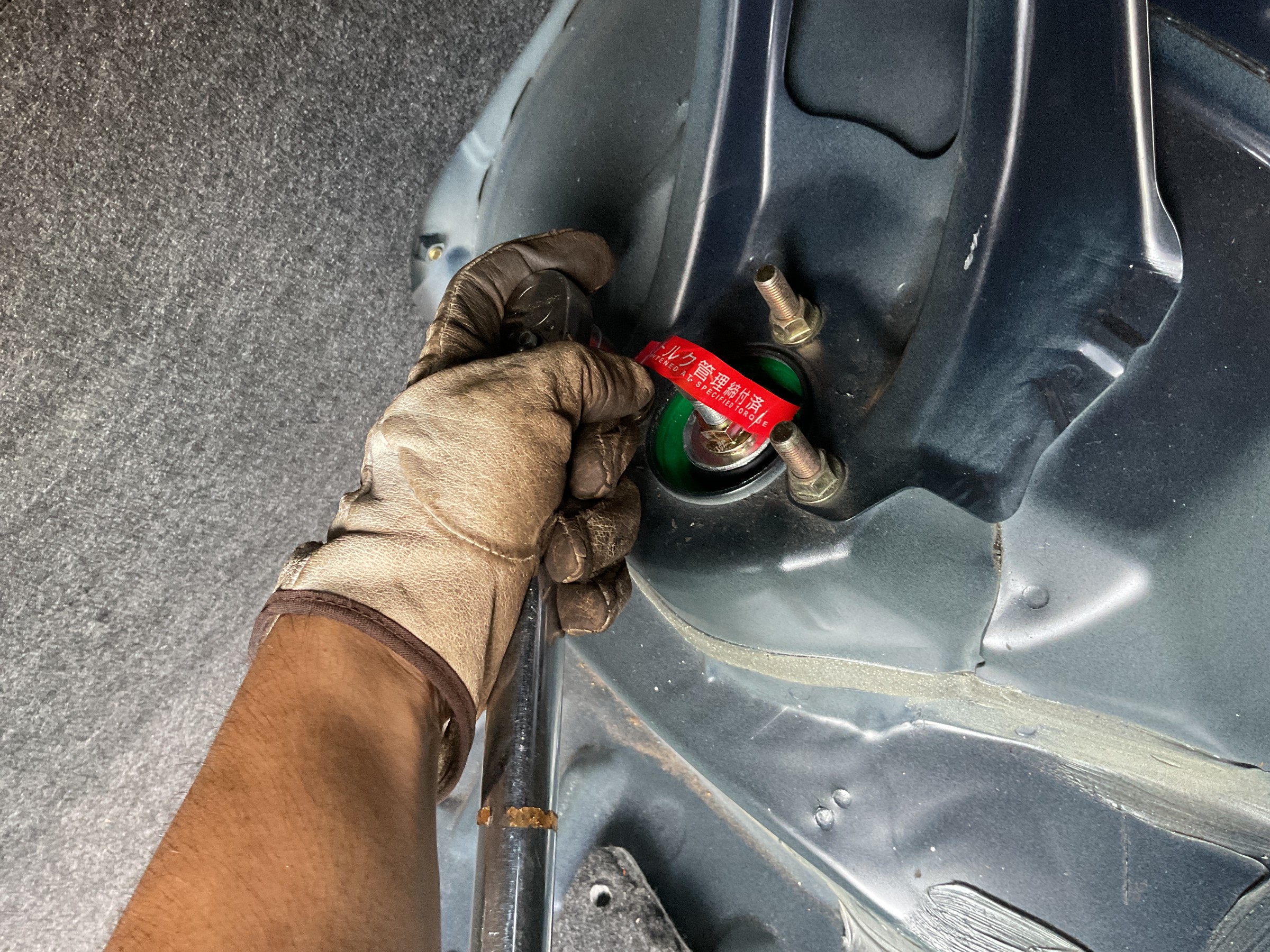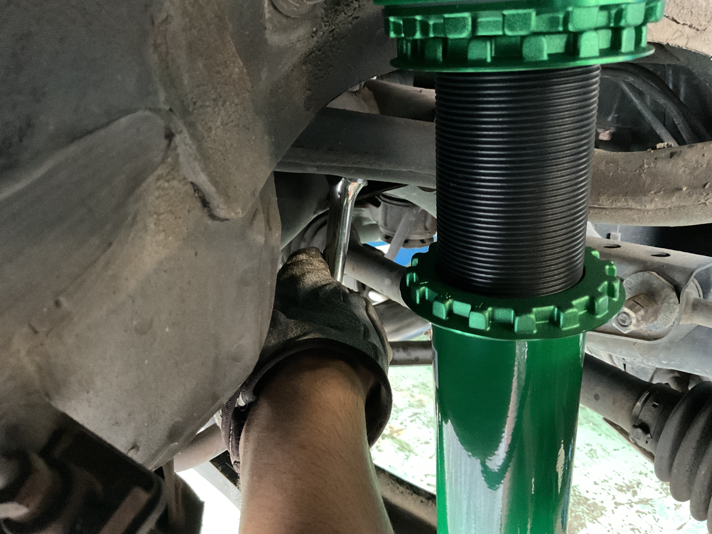 車高調を取り付けして車高の調整が終わったら、4輪にしっかり荷重をかけた状態で、1G締め!