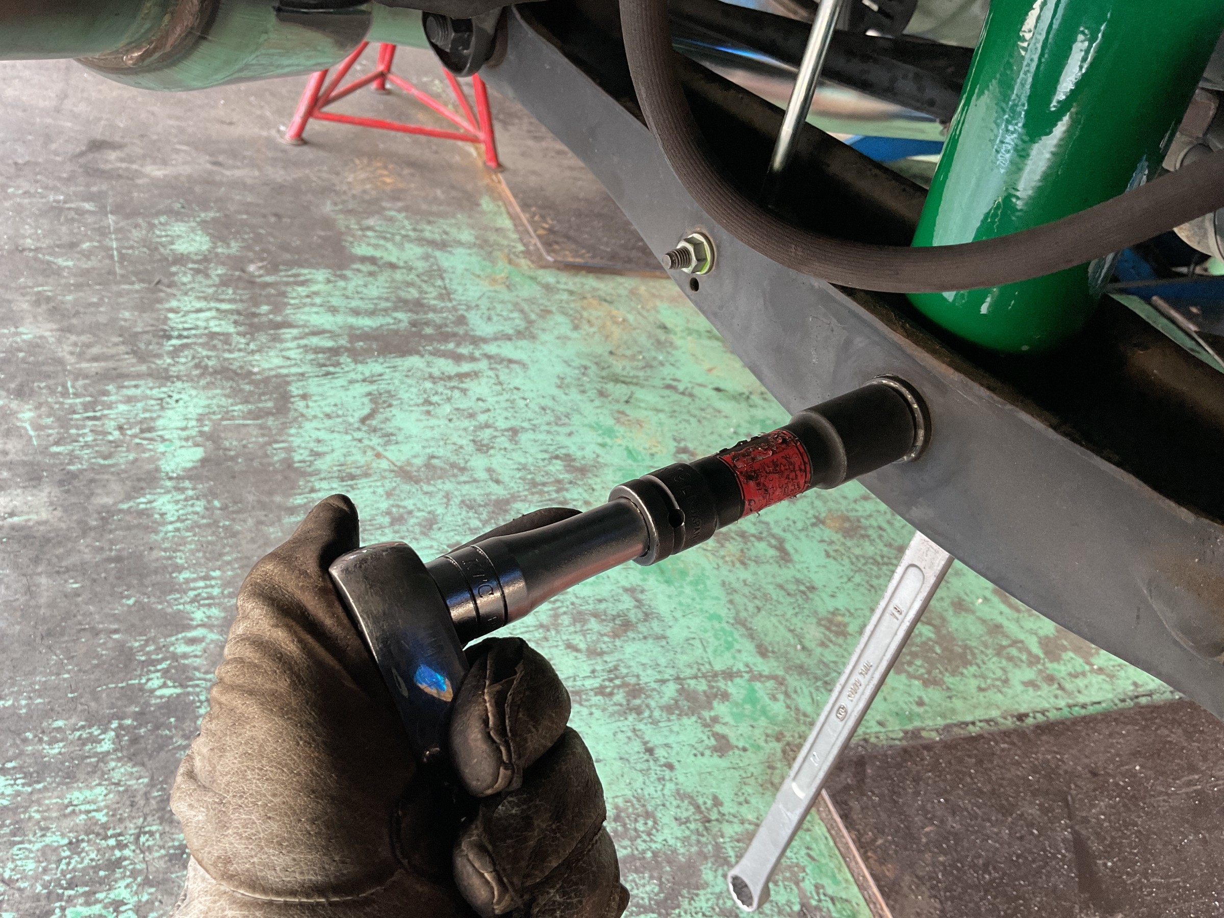 1G締めは疑似的に“タイヤを装着して接地させた状態”を作り出し、その状態で捻じれてしまっている各ブッシュのテンションを締めなおすことでアームブッシュのニュートラル位置を現状のローダウン状態に合わせてあげる作業ですヾ(゚д゚)ノ゛