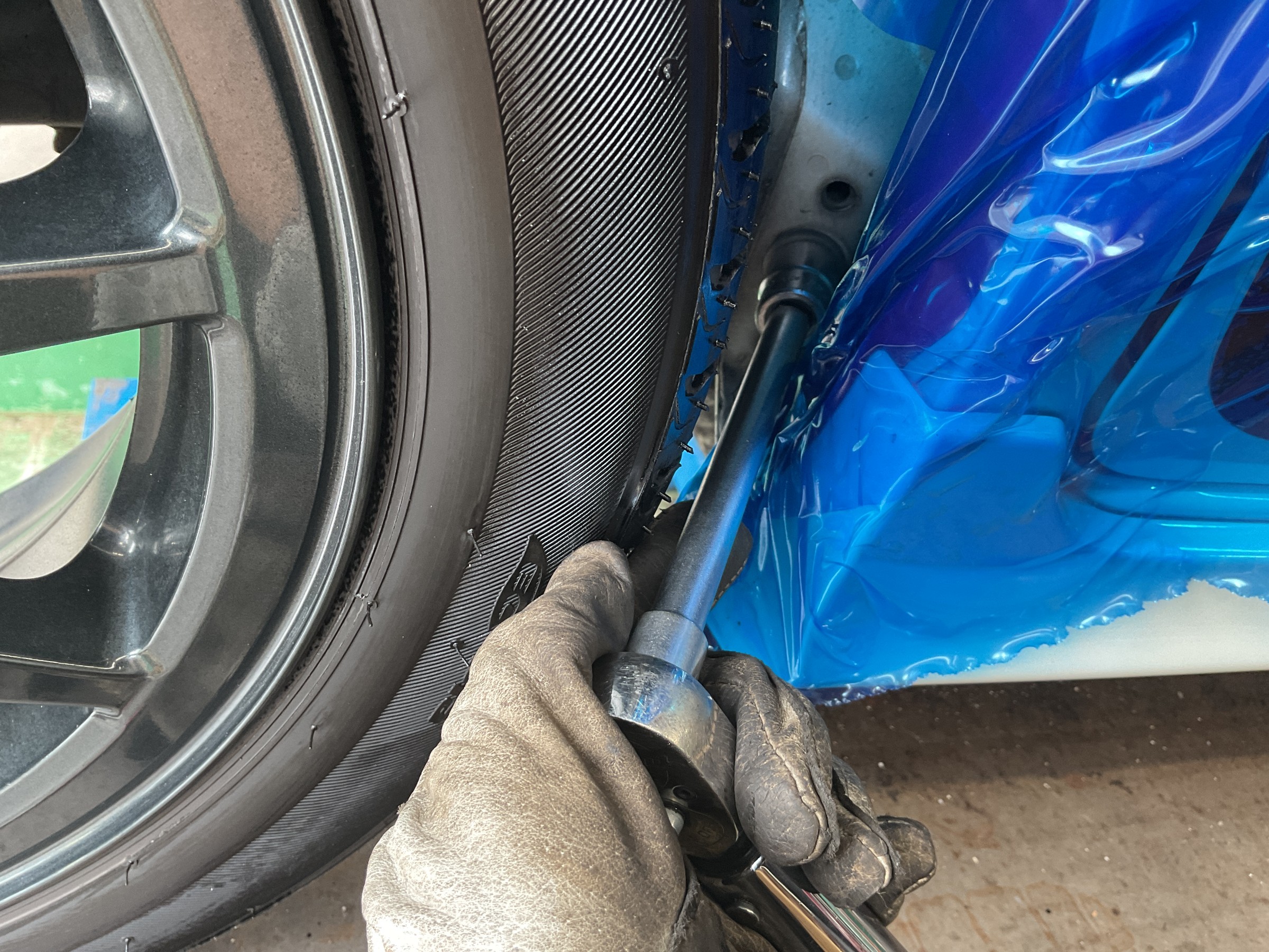 1G締めは疑似的に“タイヤを装着して接地させた状態”を作り出し、その状態で捻じれてしまっている各ブッシュのテンションを締めなおすことでアームブッシュのニュートラル位置を現状のローダウン状態に合わせてあげる作業ですヾ(゚д゚)ノ゛