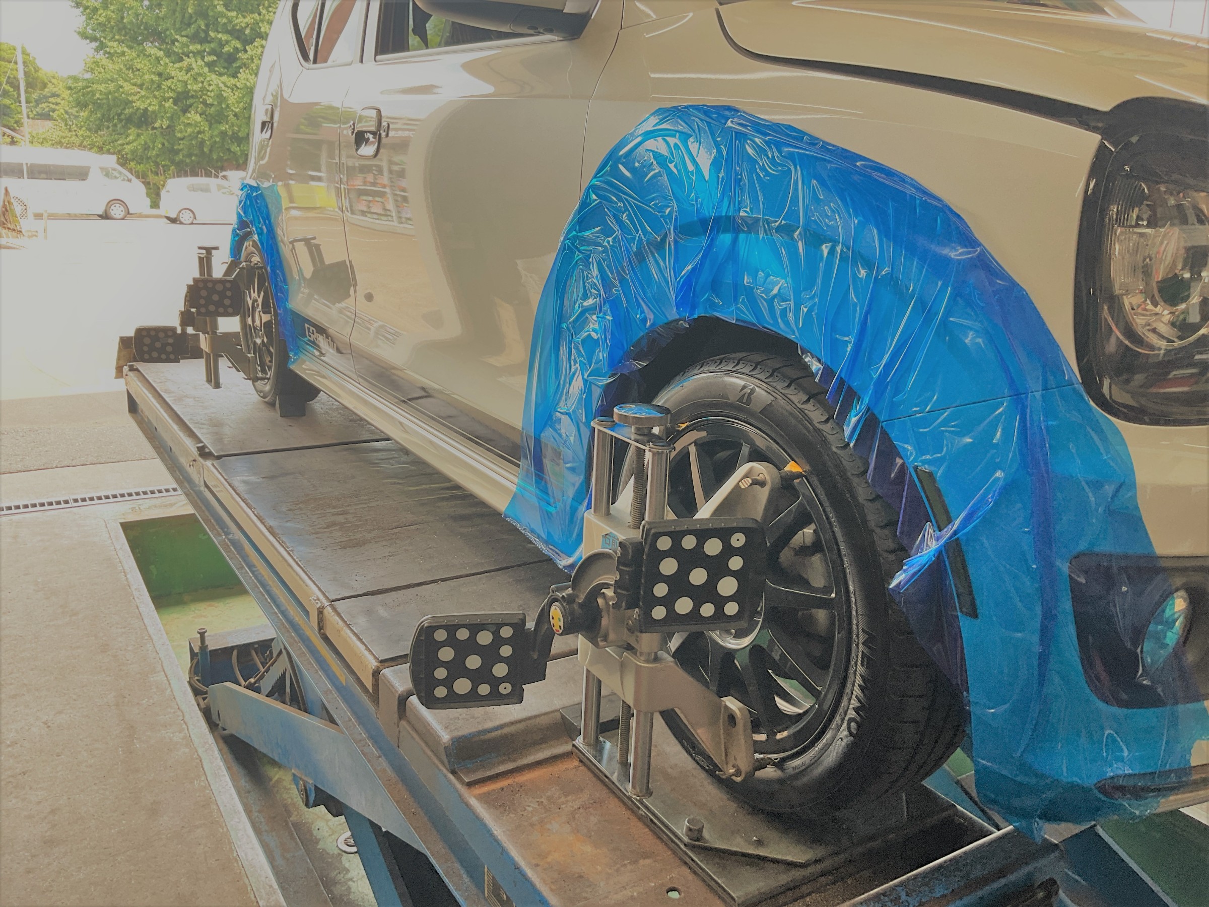 サスペンション交換を行うと必ずタイヤの角度にズレが生じるので、そこをしっかり修正しないとタイヤが変な減り方をしたりハンドルのセンター位置が大幅にズレたりするので、しっかりアライメント調整で補正させていただきました!
