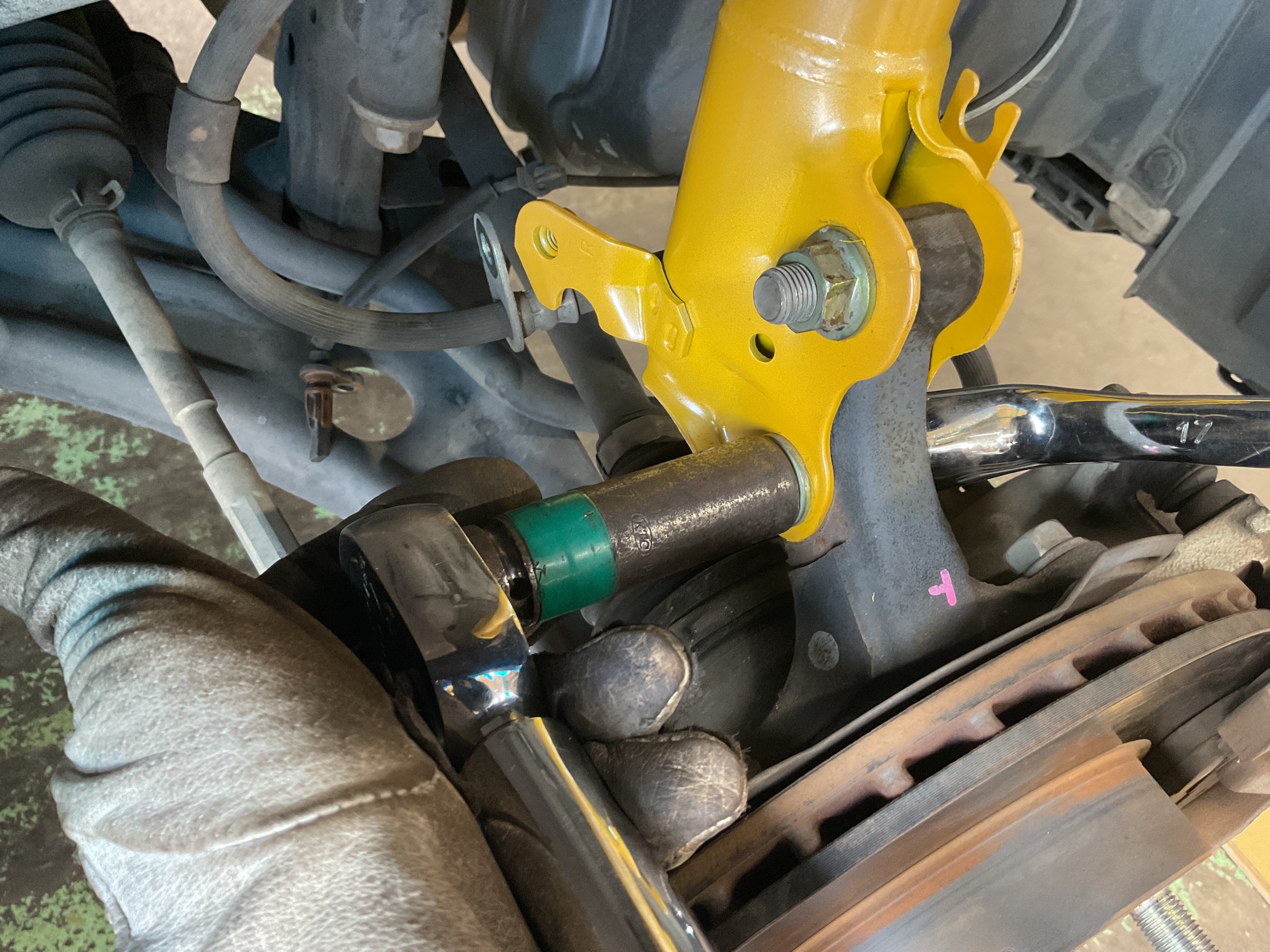 ダウンサスを取り付けしたら、4輪にしっかり荷重をかけた状態で、1G締め!
