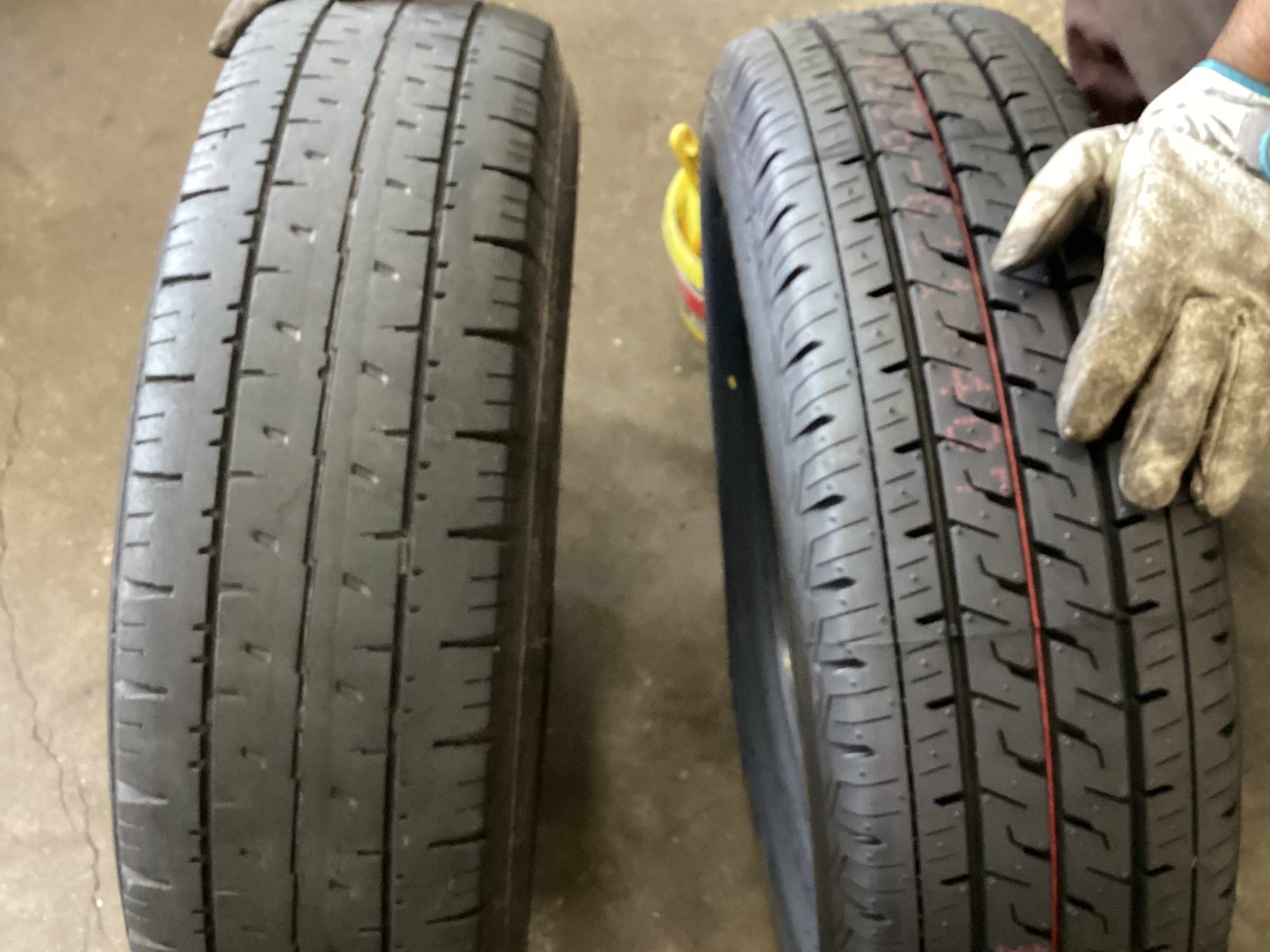 新品タイヤと旧タイヤの比較です。比べてみると、溝が減ってきていることがわかるかと思います。