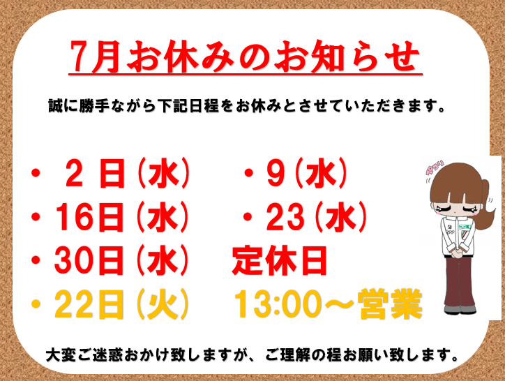 定休日のご案内!! ポスト 2025年7月22日 皆様、こんにちは(^^)/ 当店定休日のご案内です! 7月23日(水)は、定休日となります。 ご利用のお客様に置かれましては、ご迷惑おかけいたしますが、 何卒ご理解ご了承の程お願い申し上げます。 タイヤ館 八千代 住所:276-0046千葉県八千代市大和田新田988-6 電話番号: 047-458-1777 相談予約 タイヤ点検・安全点検/タイヤ履き替え/オイル交換/その他ピット作業の予約