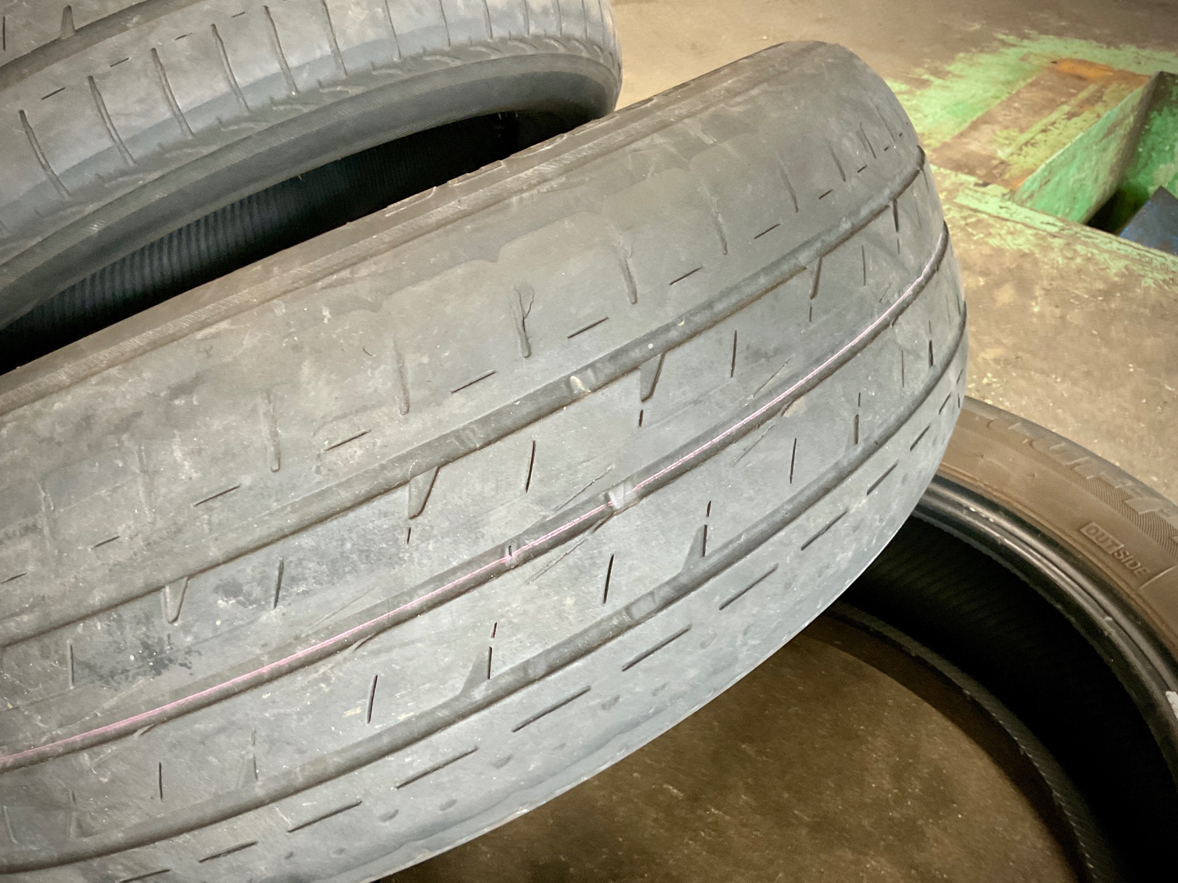 交換前のタイヤは摩耗が進み溝が浅くなっています。
