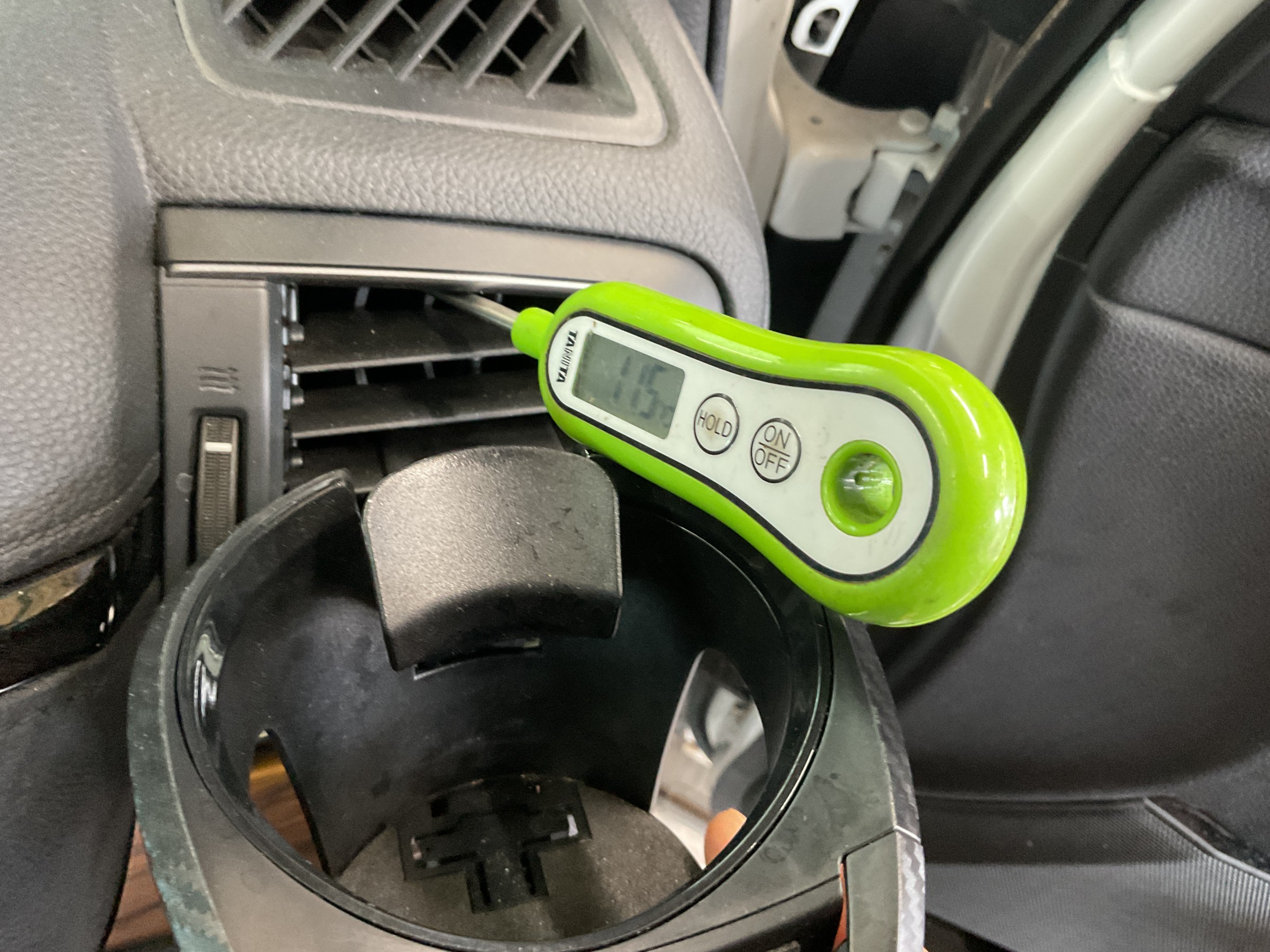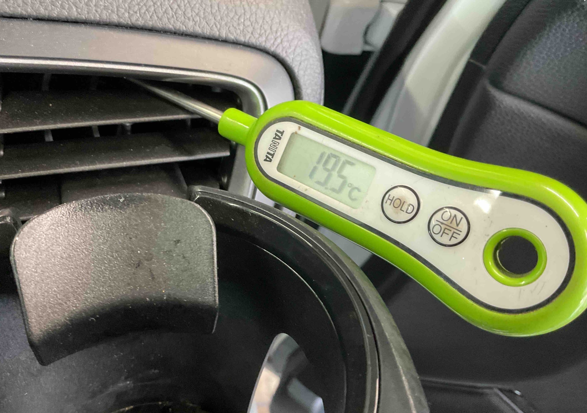 アクセルを軽く踏んで2000回転キープくらいでコンプレッサーを回すと更に11.5℃まで下がりますが、