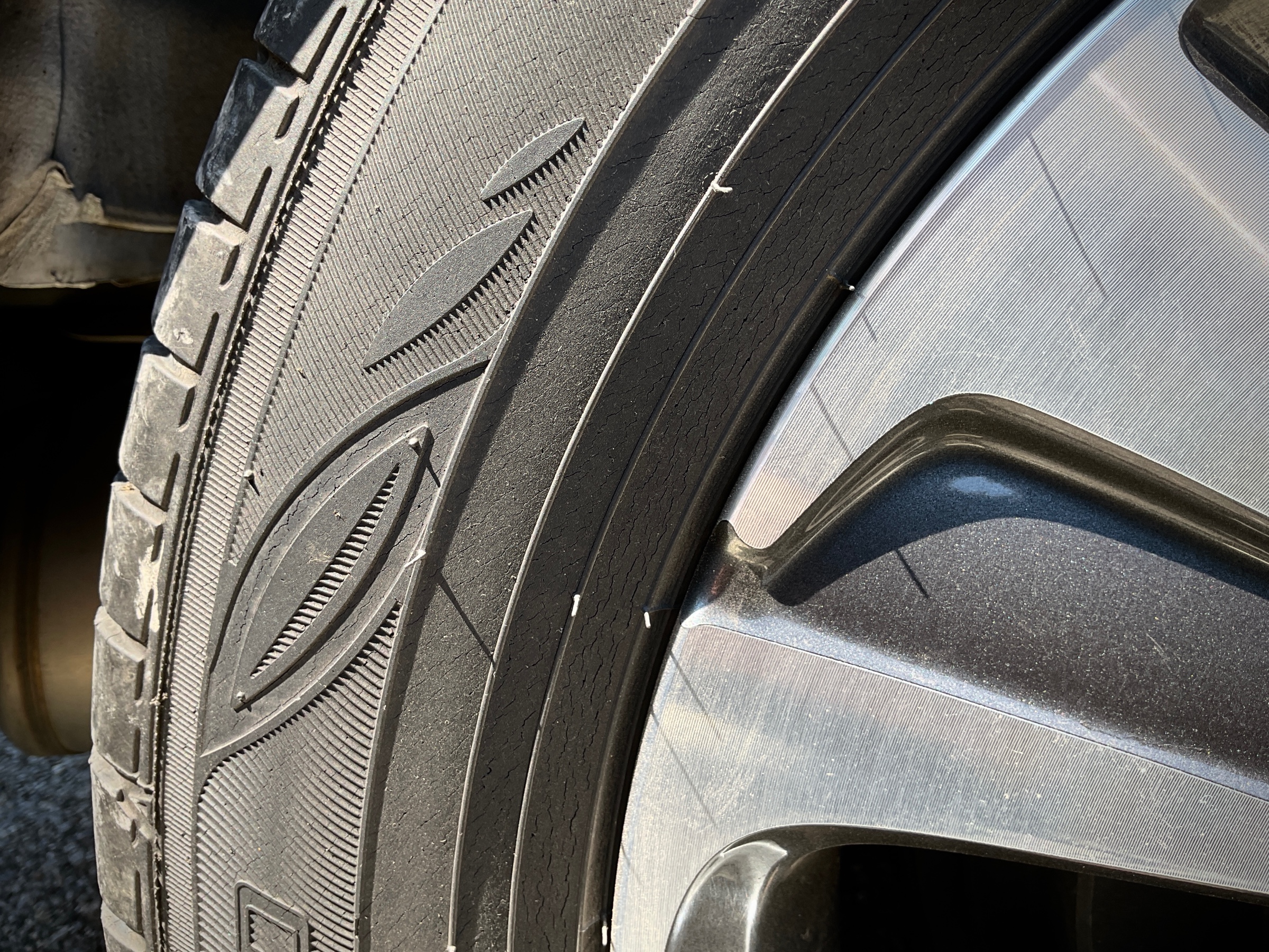 交換前のタイヤは側面や接地面に経年劣化でのひび割れが発生しています。