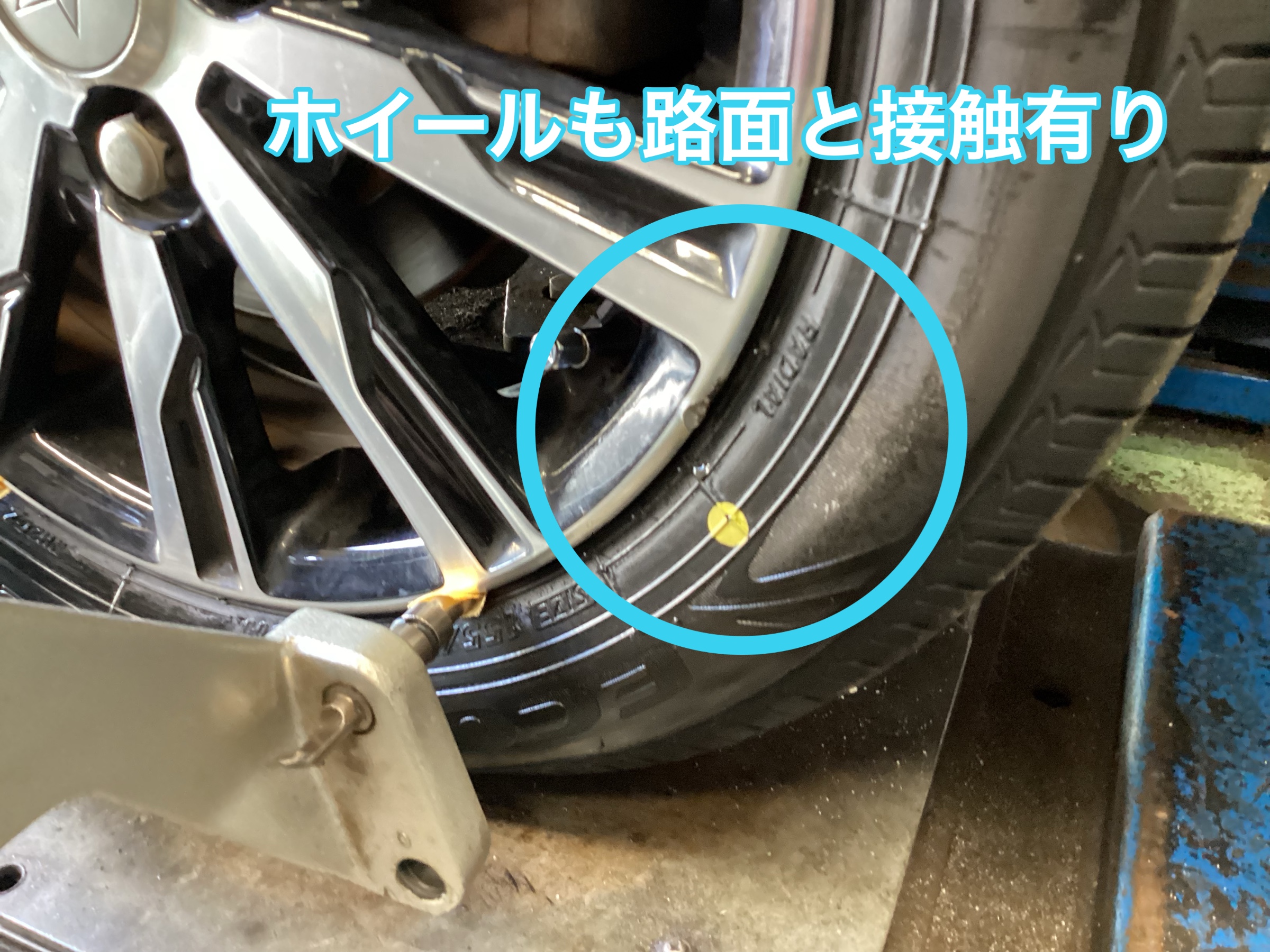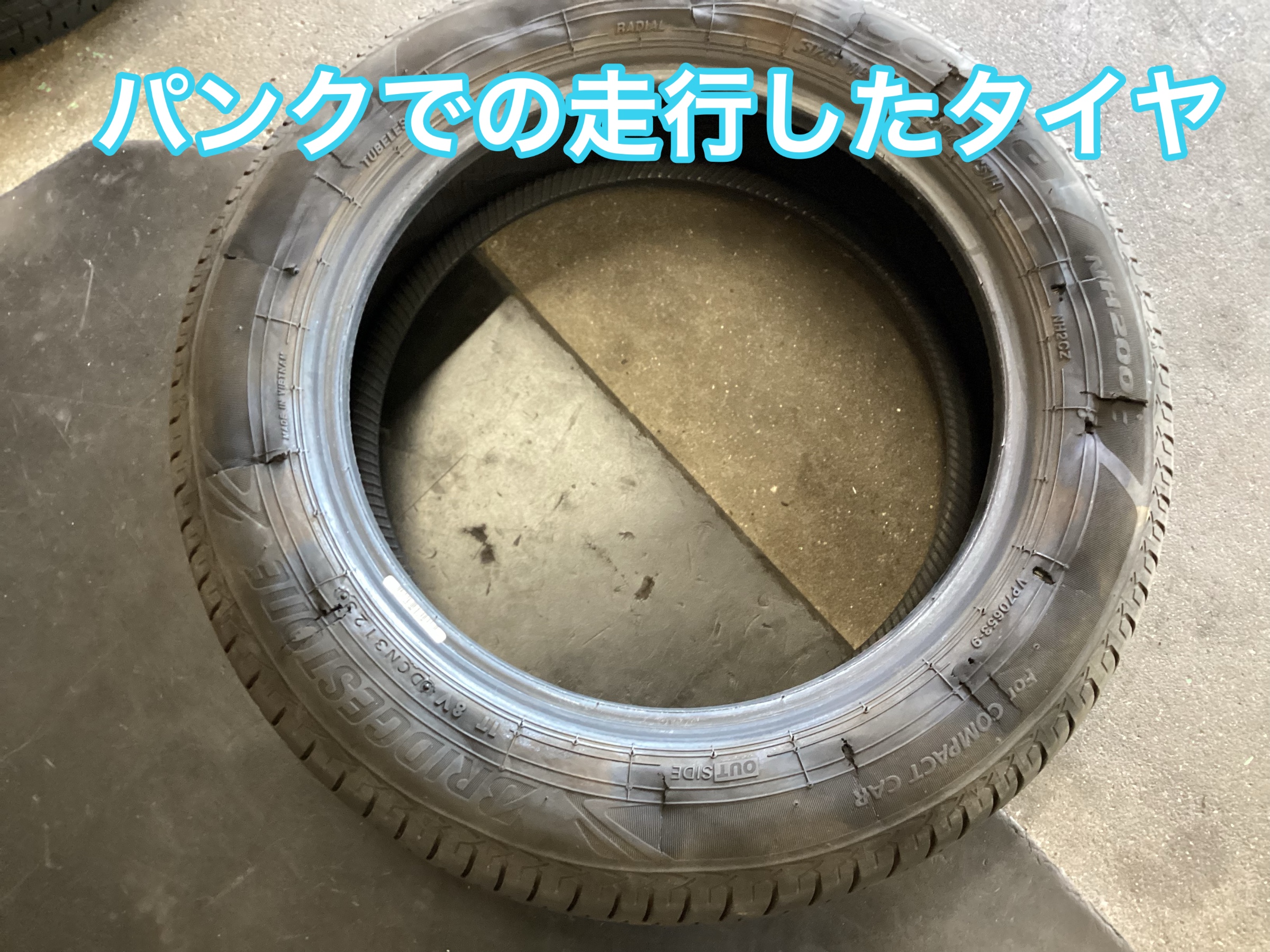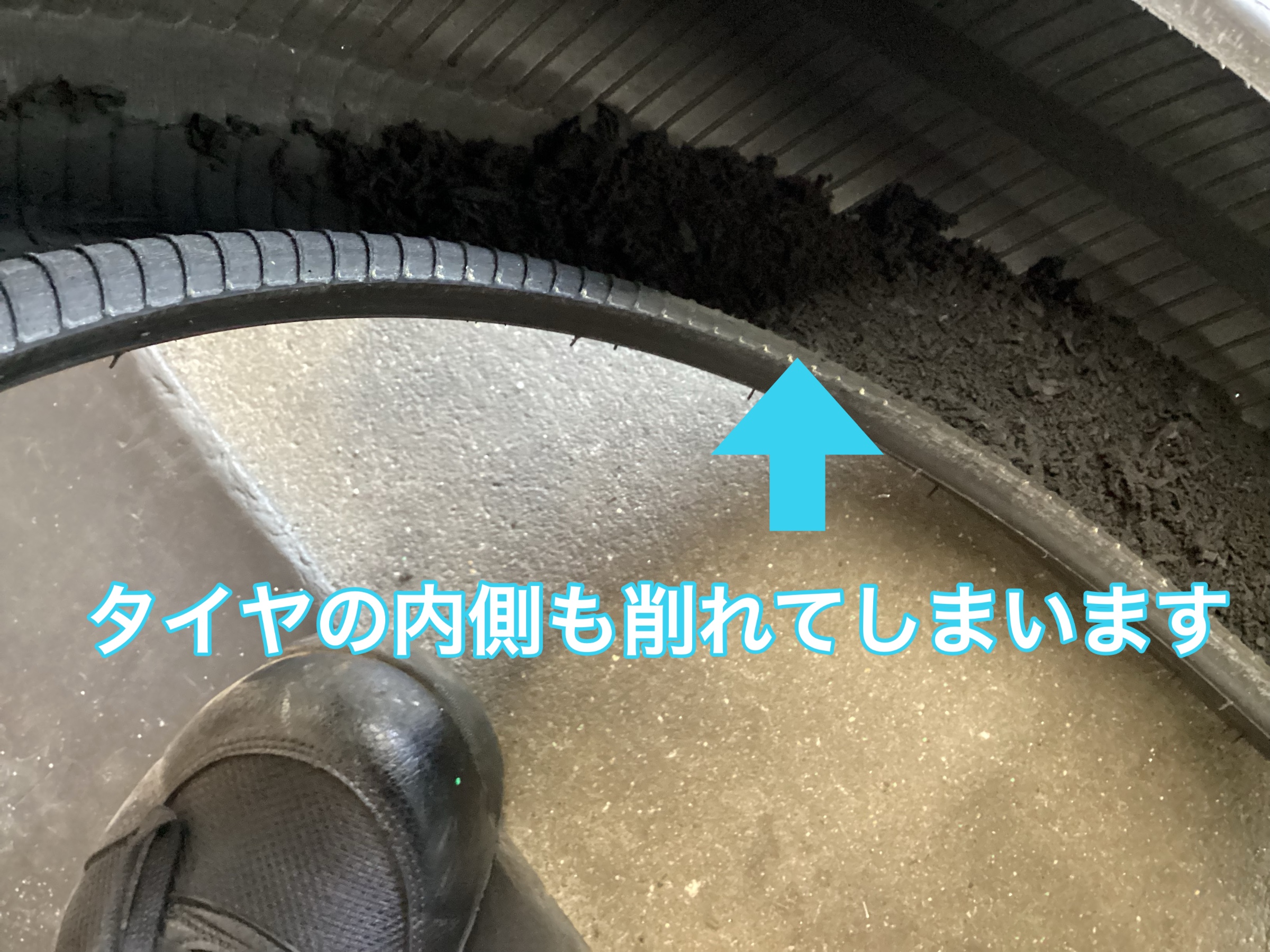 タイヤも内側も削れてしまいます、タイヤの外側サイドに一周、引きずり痕が出ている場合も内部損傷