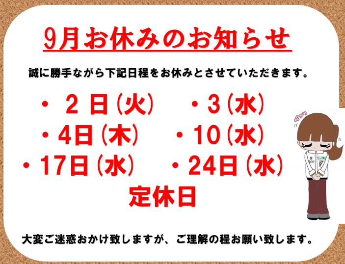 9月定休日のご案内!! ポスト 2025年9月1日 皆様、こんにちは(^^)/ タイヤ館八千代のホームページをご覧いただき誠にありがとうございます。 当店定休日のご案内です。 9月2日(火)・3日(水)・4日(木)・10日(水)・17日(水)・24日(水) 上記の日程は、定休日となります。 ご利用のお客様に置かれましては、ご迷惑おかけいたしますが、 何卒ご理解ご了承の程お願い申し上げます。 タイヤ館 八千代 住所:276-0046千葉県八千代市大和田新田988-6 電話番号: 047-458-1777 相談予約 タイヤ点検・安全点検/タイヤ履き替え/オイル交換/その他ピット作業の予約