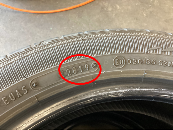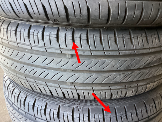 交換前のタイヤは、2019年製造のタイヤでしたので、タイヤの側面、接地面ともに、経年劣化によるひび割れが見受けられました。