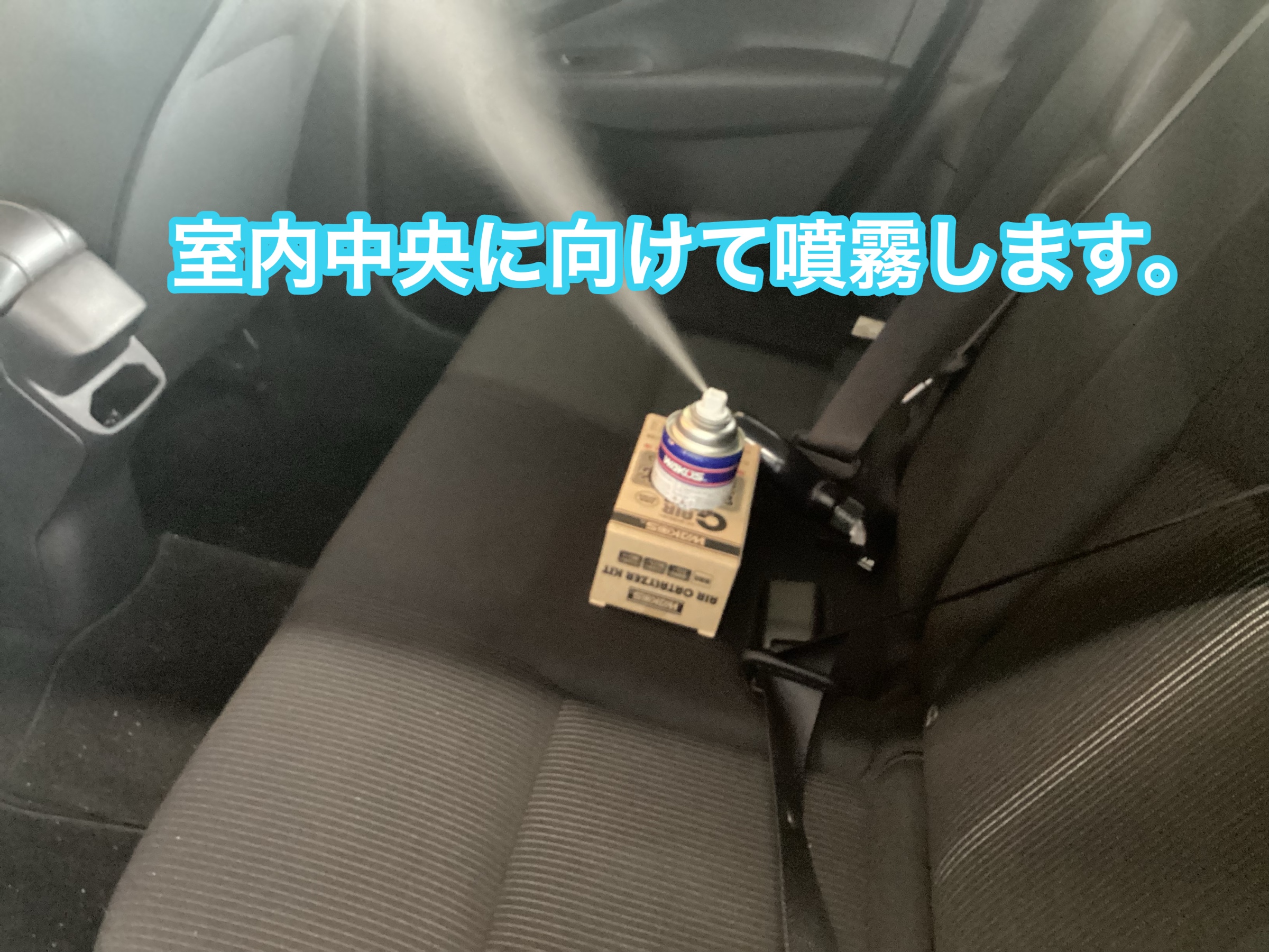 最後に室内に専用スプレー缶噴霧後にエアコンフィルターに専用のフィルターを織り込みますね。