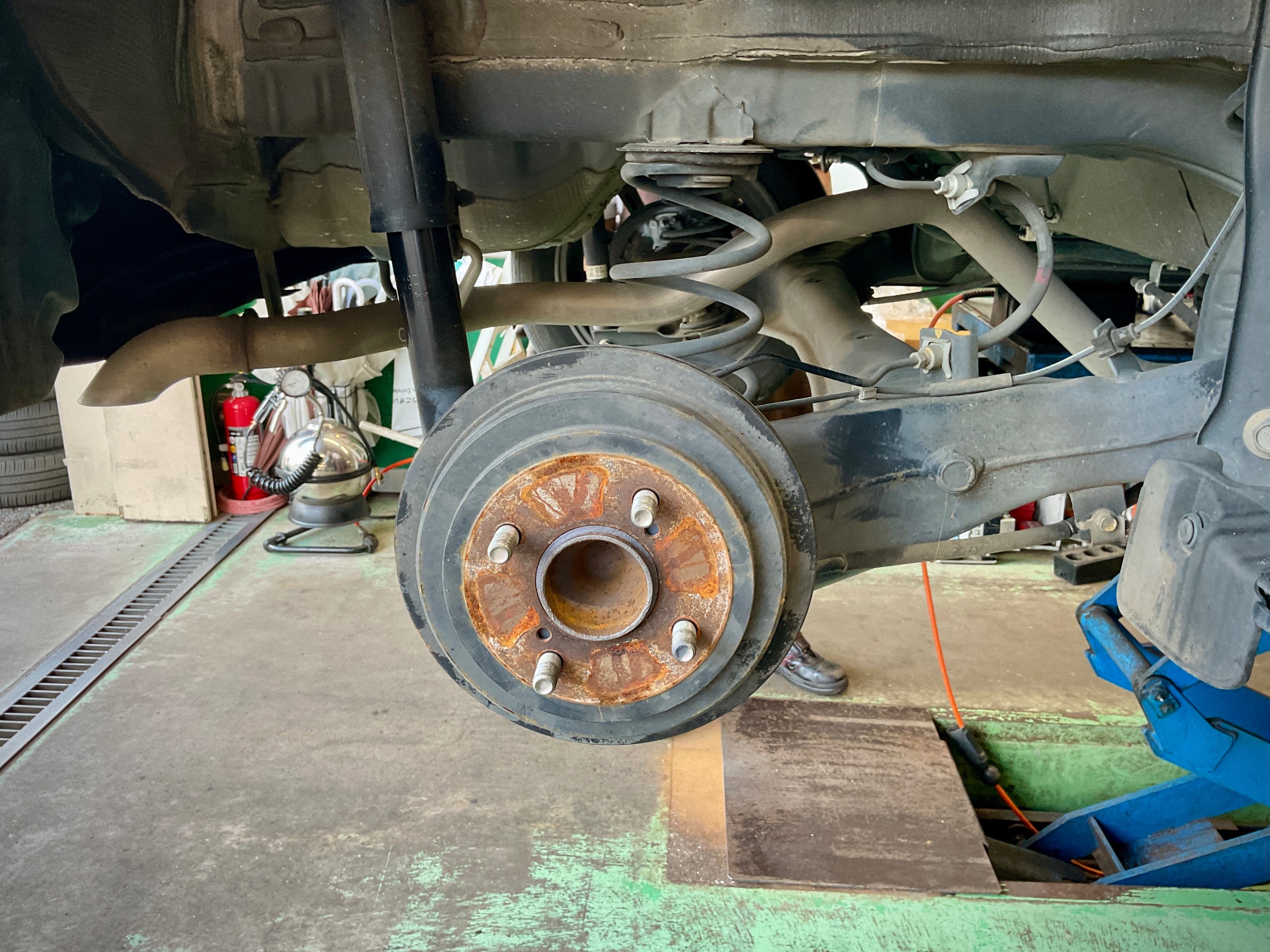 タイヤホイールを外してみるとハブ面やハブボルトに赤サビが発生していますね。